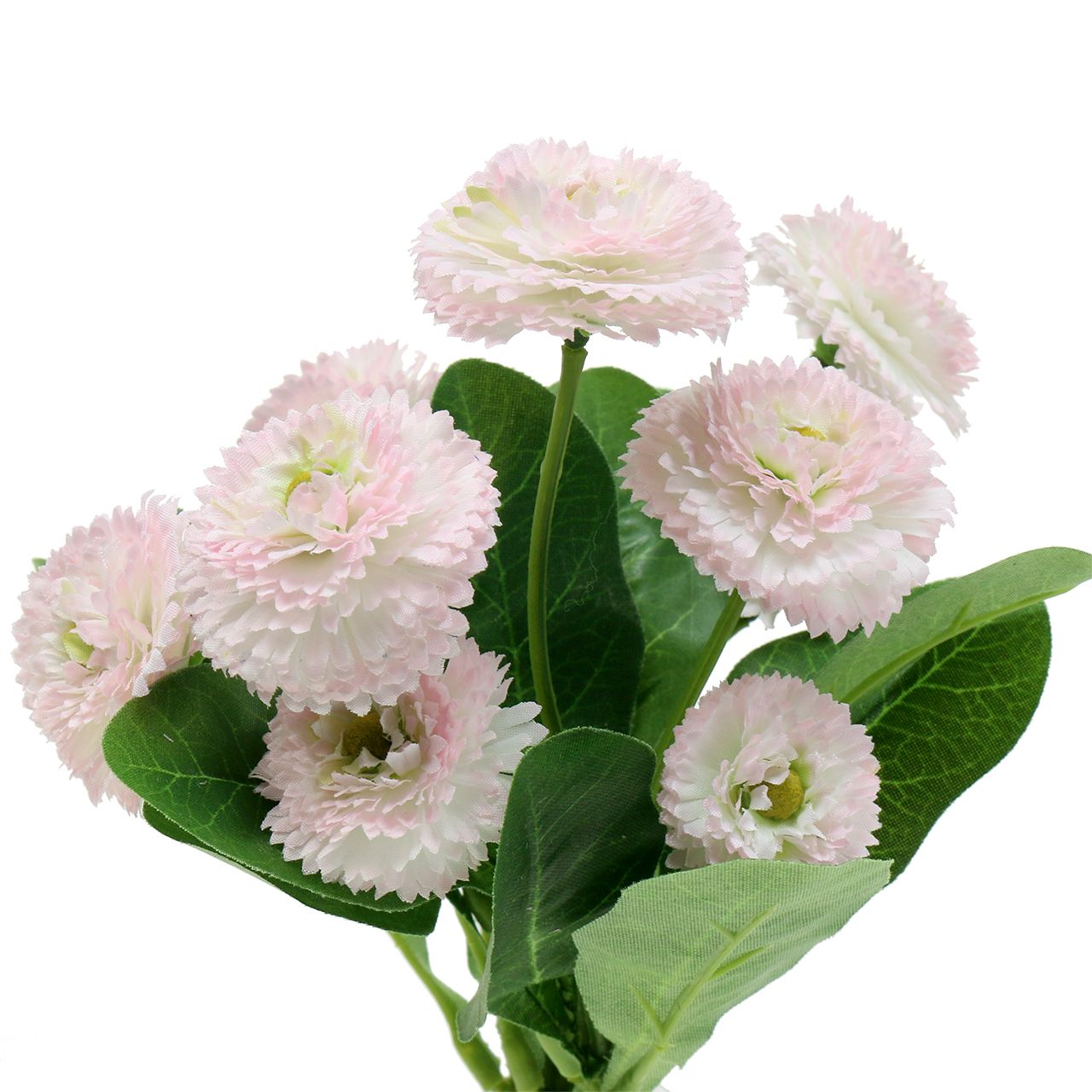 W szczególnej delikatności jasnoróżowego koloru ukazuje się ta wysokiej jakości wiązanka sztucznego Bellis. W ramach ekskluzywnej serii produktów VIANA, zwrócono uwagę na wysoką jakość sztucznego kwiatu. Główki kwiatów są szczególnie filigranowe, wzorowane na naturalnym oryginale i urzekają swoim pomponowym wyglądem. Każda wiązanka składa się z 5 różnej wielkości kwiatów i wygląda absolutnie harmonijnie z autentycznymi zielonymi liśćmi. Dzięki elastycznemu drutowi, który został wbudowany w szyjki jedwabnych kwiatów, możesz ułożyć dekoracyjne kwiaty wspaniale według własnego uznania.