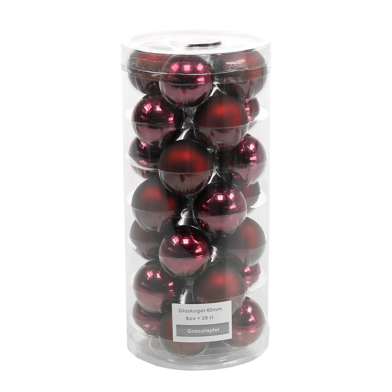 Łącznie 28 bombek choinkowych w kolorach granatu i różu otrzymujesz w okrągłym plastikowym pudełku, w którym zawsze możesz schować szklane bombki po użyciu do bezpiecznego przechowywania. Ozdoby choinkowe są zróżnicowane, więc dostajesz 14 sztuk w każdym z dwóch kolorów. Średnica wynosi około 4 centymetrów. Łącznie z zawieszeniem, kule osiągają wysokość ok. 5,3 cm.