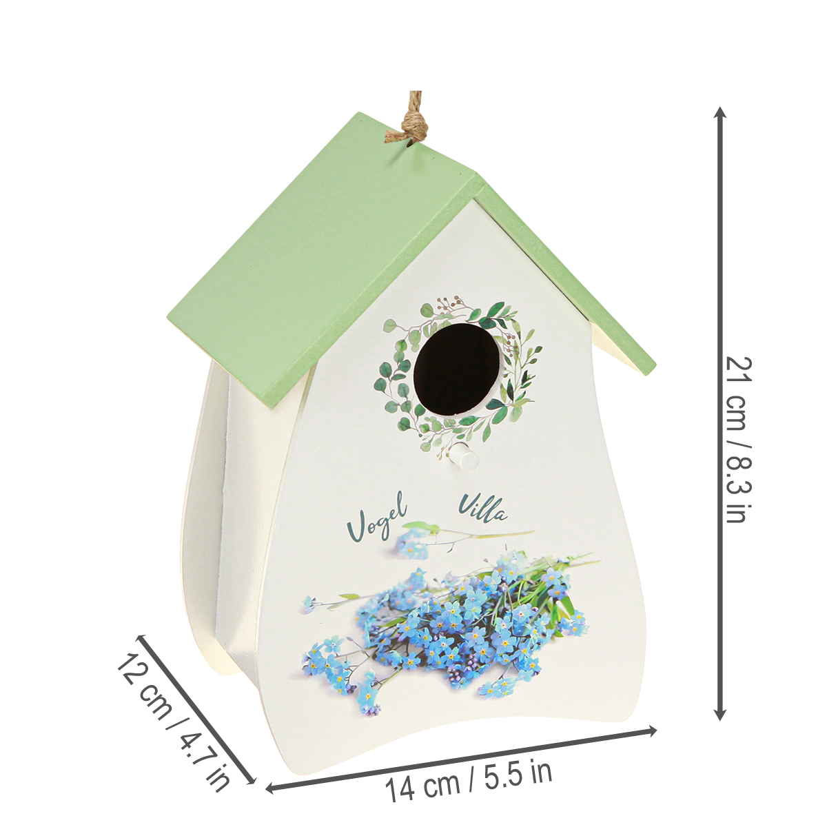 Ta budka dla ptaków to nie tylko element dekoracyjny; to mały skarb dla każdego, kto ceni urocze detale. Świeża zieleń dachu idealnie współgra z delikatną bielą drewnianej fasady, ozdobionej delikatnymi motywami kwiatowymi. Przywołuje urok przytulnych wiejskich domów i idealnie wpasowuje się w wystrój vintage lub rustykalny. Mierząca 21 centymetrów wysokości, świetnie prezentuje się na każdym parapecie lub ścianie, od razu przyciągając wzrok. A co najlepsze? Jest czysto dekoracyjna, dzięki czemu idealnie nadaje się do użytku wewnątrz. Kunszt wykonania jest wyraźnie widoczny, dzięki czemu każda budka dla ptaków jest unikatowa. Jest szczególnie zachwycająca wiosną i latem: ustaw ją przed wazonem ze świeżymi kwiatami lub dodaj ten uroczy akcent do wiosennej aranżacji stołu. I bądźmy szczerzy, kto nie kochałby odrobiny kwiatowego piękna i naturalnych elementów w swoim domu? Renowacja jest banalnie prosta: wystarczy otworzyć tylną część, dodać drobne dodatki lub kompozycje kwiatowe, a domek natychmiast rozbłyśnie świeżym, nowym wyglądem. Domek dla ptaków jest również świetnym pomysłem na wyjątkowy prezent, ponieważ jest indywidualny, praktyczny i ponadczasowo piękny.