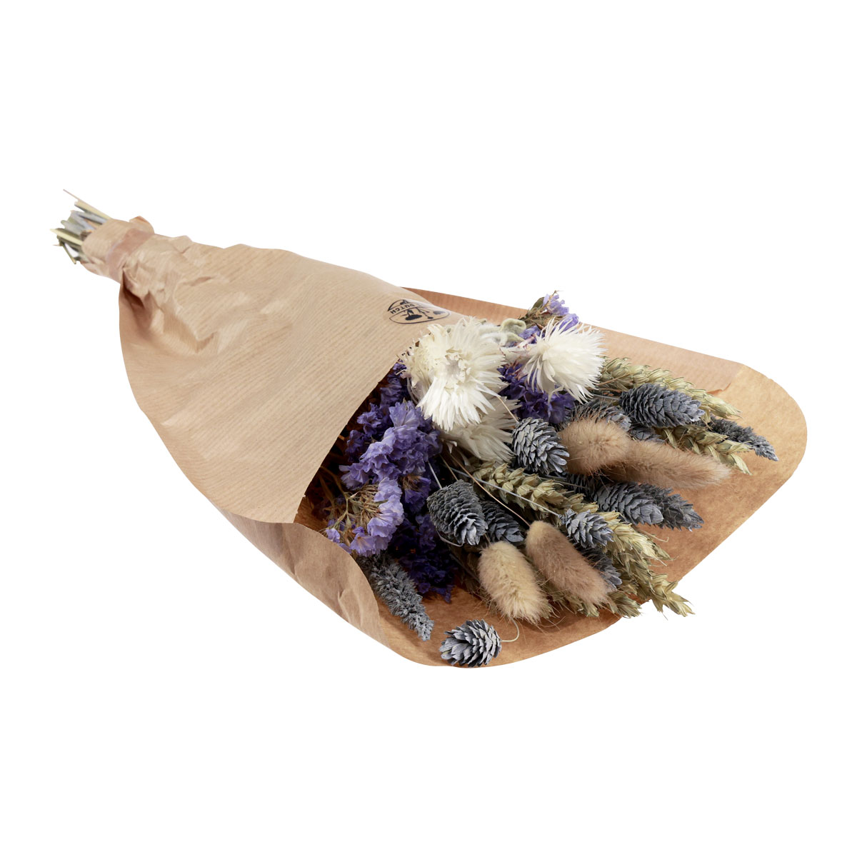 Tutaj otrzymasz wspaniały bukiet suszonych kwiatów wykonany z białych kwiatów słomy, lagurusa, zbóż i fioletowej lawendy morskiej oraz falaris w kolorze niebiesko-szarym.Wiązany mini bukiet suszonych kwiatów idealnie nadaje się do wazonu. Suszone kwiaty można wykorzystać także do prac rękodzielniczych lub wykonać dekoracje z suszonych kwiatów w postaci kompozycji lub wianków z suszonych kwiatów.
