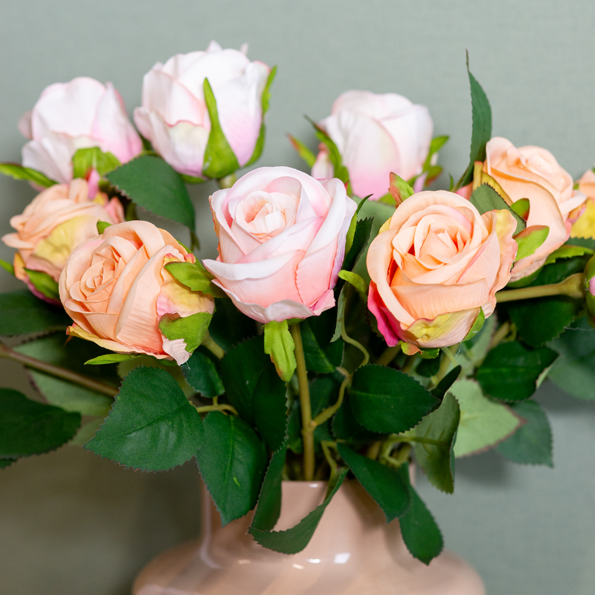 Uwielbiasz urok róż, ale chcesz uniknąć kłopotów z ich pielęgnacją? Żaden problem! Z naszym bukietem sztucznych róż możesz wnieść ponadczasowe piękno królowej kwiatów prosto do swojego domu. Idealny dla każdego, kto ceni elegancką dekorację bez potrzeby stosowania świeżych kwiatów. Niezależnie od tego, czy będzie to centralny punkt salonu, urocza dekoracja stołu na specjalne okazje, czy stylowy prezent – ten bukiet róż nada każdemu wnętrzu wyjątkowego charakteru. Delikatne, różowe, jedwabne kwiaty w połączeniu z zielonymi liśćmi wyglądają tak niesamowicie realistycznie, że można niemal zapomnieć, że są sztuczne. Twoi goście będą zachwyceni!