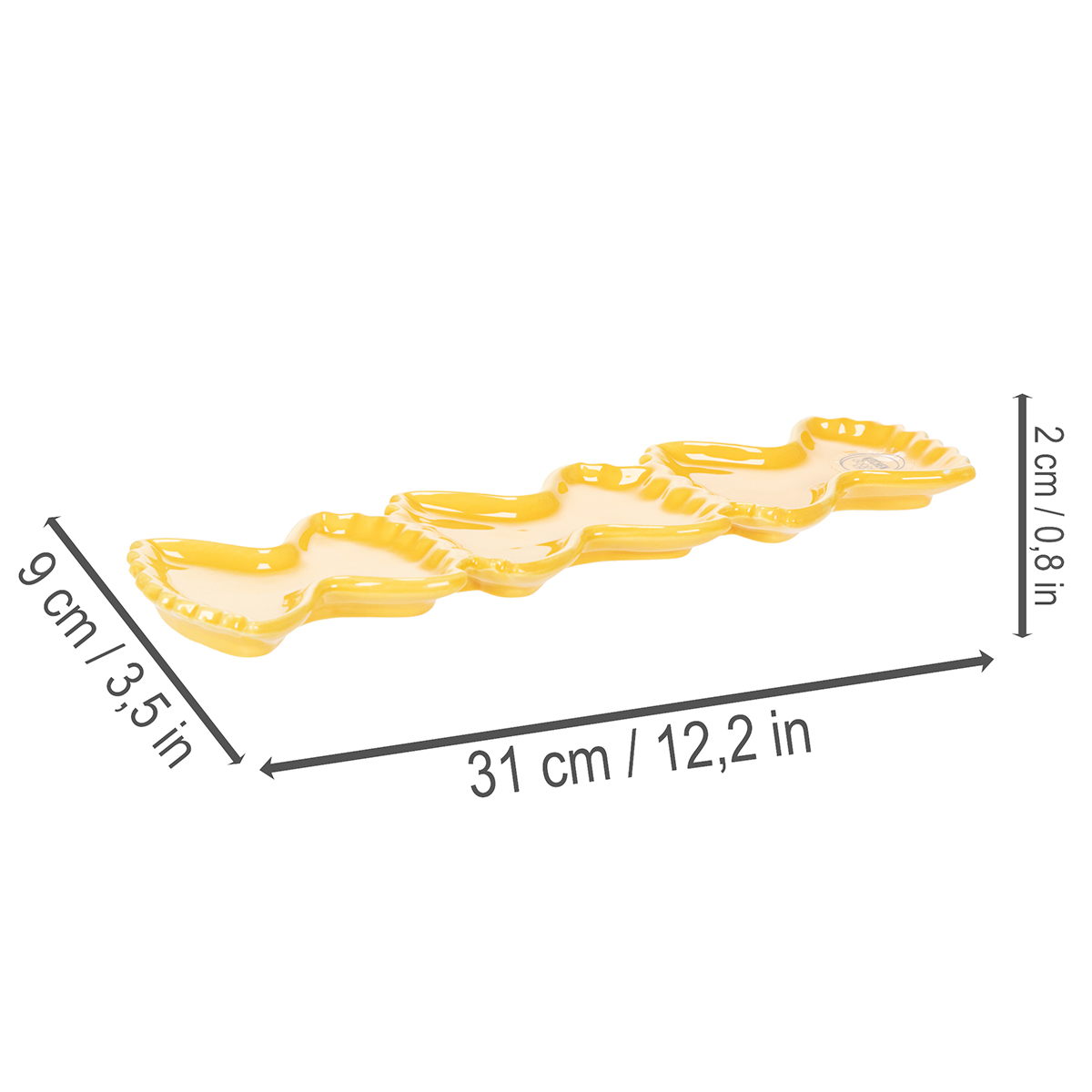 Ta ceramiczna miseczka do maczania o wymiarach 31 cm długości i 9 cm szerokości oferuje mnóstwo miejsca na Twoje ulubione małe przekąski. Zabawny, przypominający makaron kształt miseczki nadaje jej uroczego charakteru i przyciąga wzrok na każdym stole. W połączeniu z innymi żółtymi dodatkami, takimi jak wazony na makaron z naszej kolekcji, Twój stół stanie się harmonijnym dziełem sztuki, idealnie wpisującym się w styl śródziemnomorski lub letni.