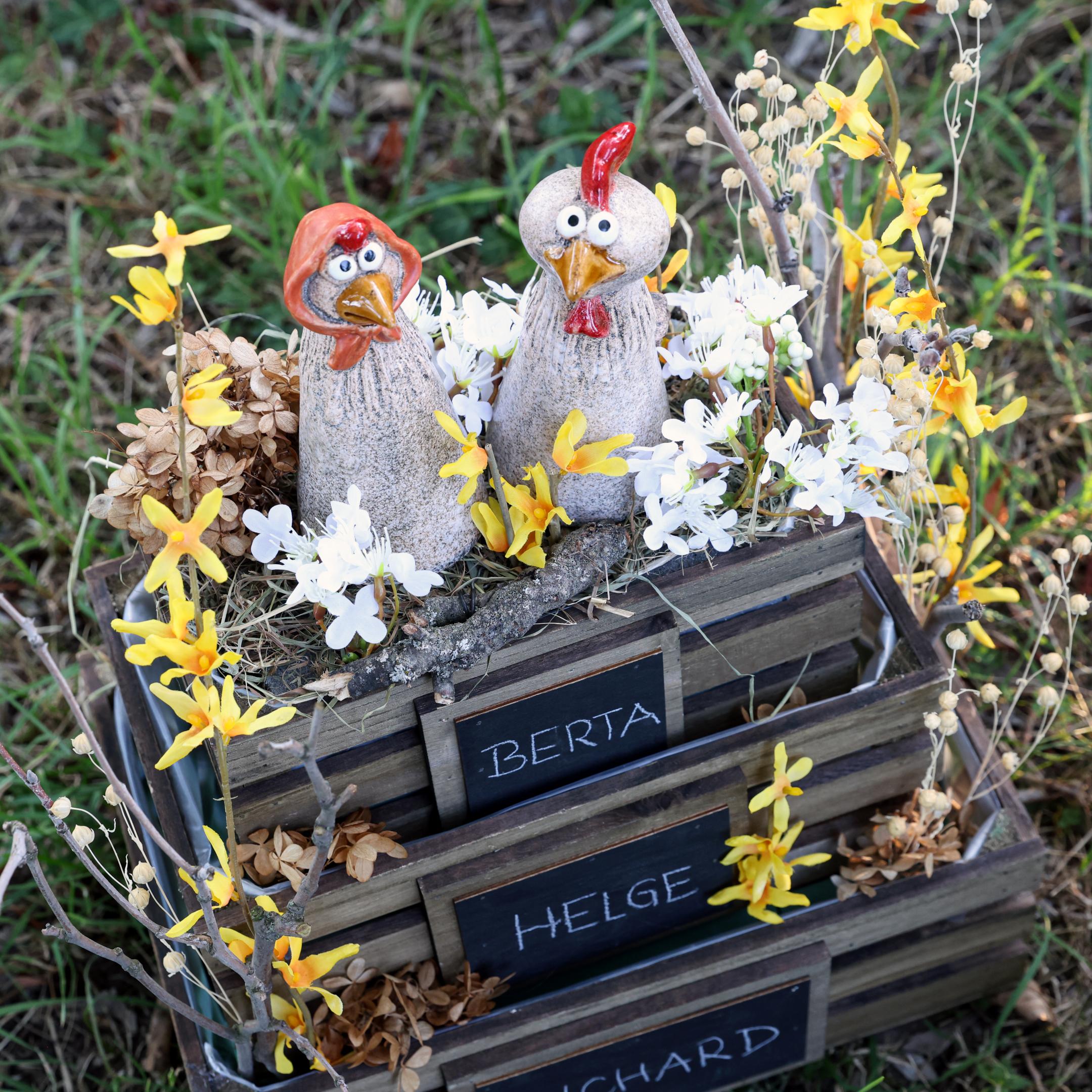Nasze ceramiczne kurczaki dekoracyjne idealnie nadają się do różnych koncepcji dekoracji. Umieść je na parapecie okna, aby rozprzestrzenić wielkanocną radość wewnątrz i na zewnątrz. Połącz zestaw z małymi kolorowymi jajkami lub kompozycjami kwiatowymi wykonanymi ze sztucznych kwiatów z Floristik24, aby stworzyć harmonijny zestaw. Szczególnie na wielkanocnym stole w połączeniu z naszym ceramicznym króliczkiem z tej samej serii wnoszą do salonu radość i życie. Lub zaskocz swoich gości tą uroczą dekoracją na tarasie podczas wielkanocnego brunchu. Aby uzyskać harmonijne ogólne wrażenie, w Floristik24 możesz znaleźć inne przedmioty, takie jak wazony w naturalnych odcieniach lub obrusy w stylu rustykalnym, które podkreślają wygląd wiejskiego domu.