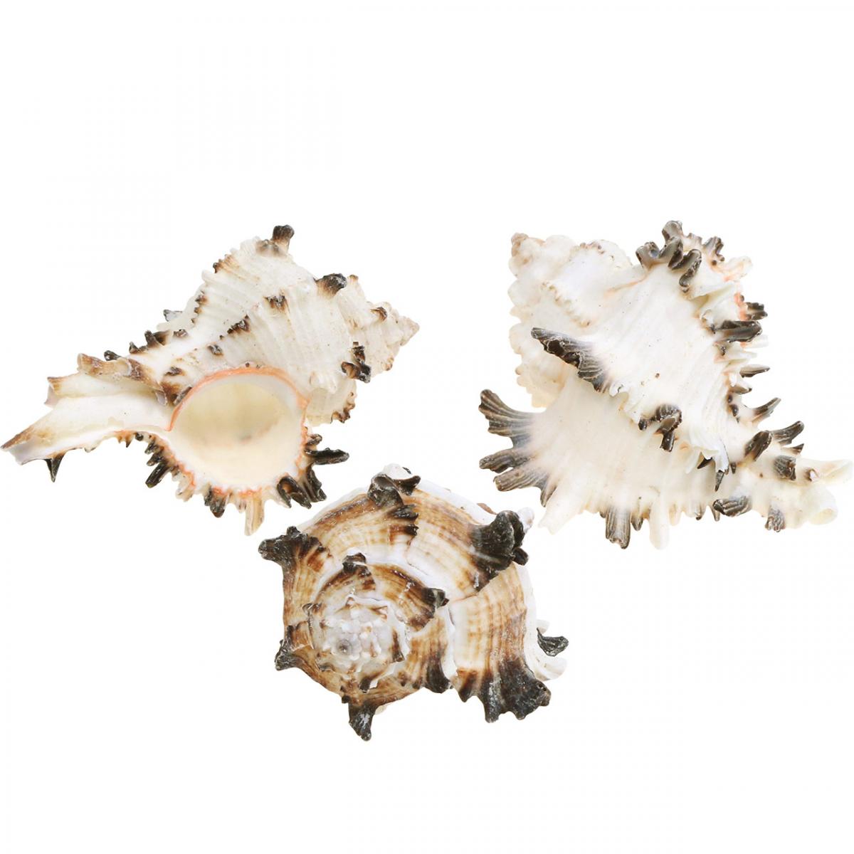 Piękne ozdobne muszle ślimaków wprowadzają zamieszanie w naturalnej dekoracji. Ślimaki morskie pochodzą z głębin Morza Indo-Pacyfiku i należą do rodzaju Murex, ślimaków kolczastych. Śnieżnobiałe i pręgowane muszle dekoracji muszli są niezwykle malownicze. Każdy naturalny ślimak został starannie wyselekcjonowany, opróżniony i oczyszczony w celu uzyskania ekskluzywnej morskiej dekoracji.