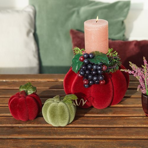 Dodaj koloru i elegancji swoim jesiennym dekoracjom dzięki tej aksamitnej dyni w czerwono-bordowym odcieniu. Flokowana dynia ma elegancki, aksamitny wygląd i harmonijnie komponuje się z nowoczesnymi i klasycznymi stylami wyposażenia. Idealny do Twojego domu lub do stworzenia atmosfery na jesiennej imprezie lub imprezie Halloween.
