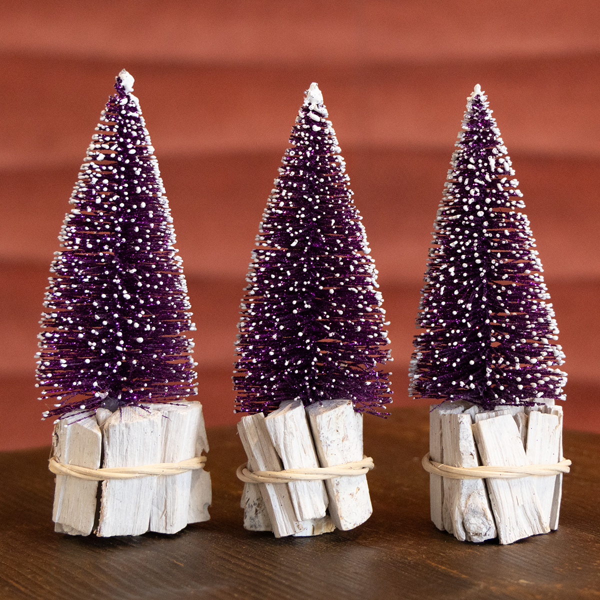 Dekoracyjna choinka bożonarodzeniowa w kolorze fioletowym z ośnieżoną końcówką na rustykalnej drewnianej podstawie 15cm, 3 sztuki.