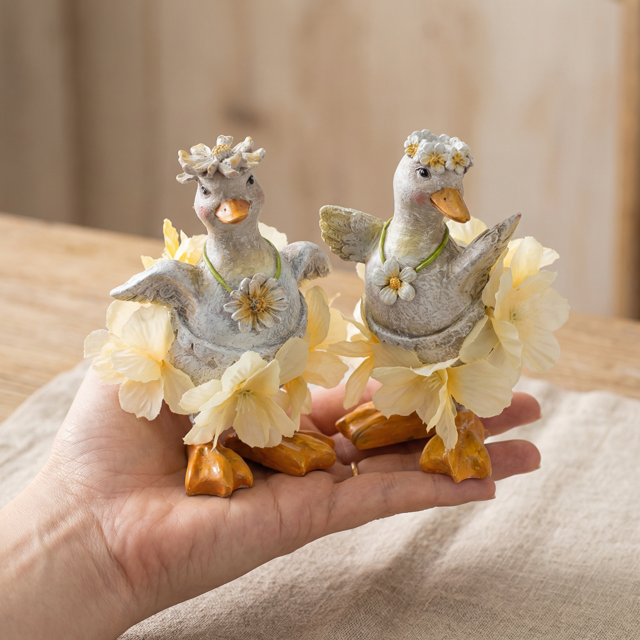 Dekoracyjne figurki kaczek z kwiatami – uroczy zestaw do wiosennych i letnich dekoracji