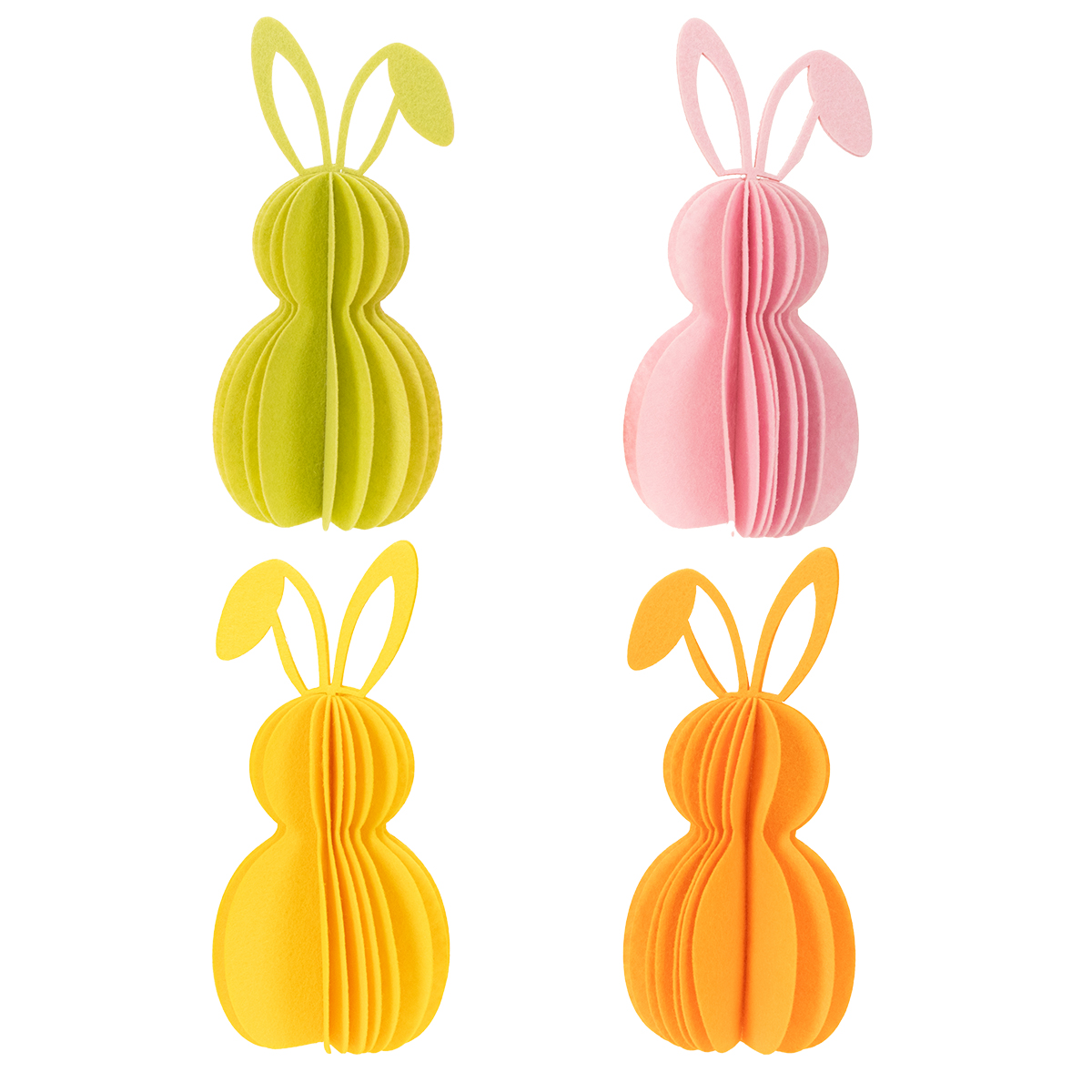 - Zestaw 4 ozdobnych papierowych króliczków w kolorze żółtym, pomarańczowym, zielonym i różowym
