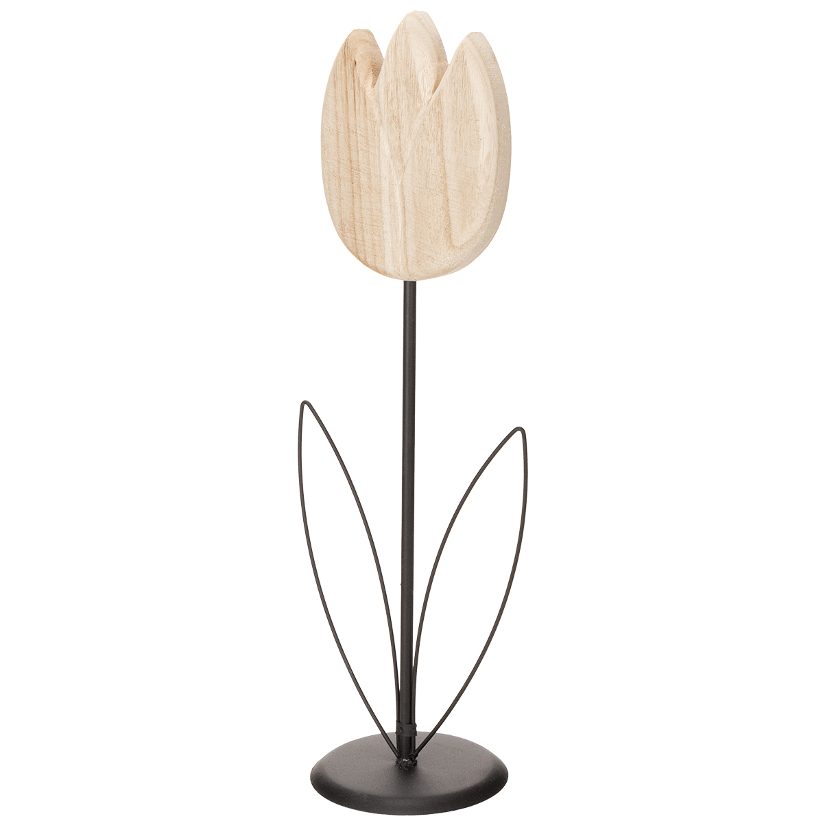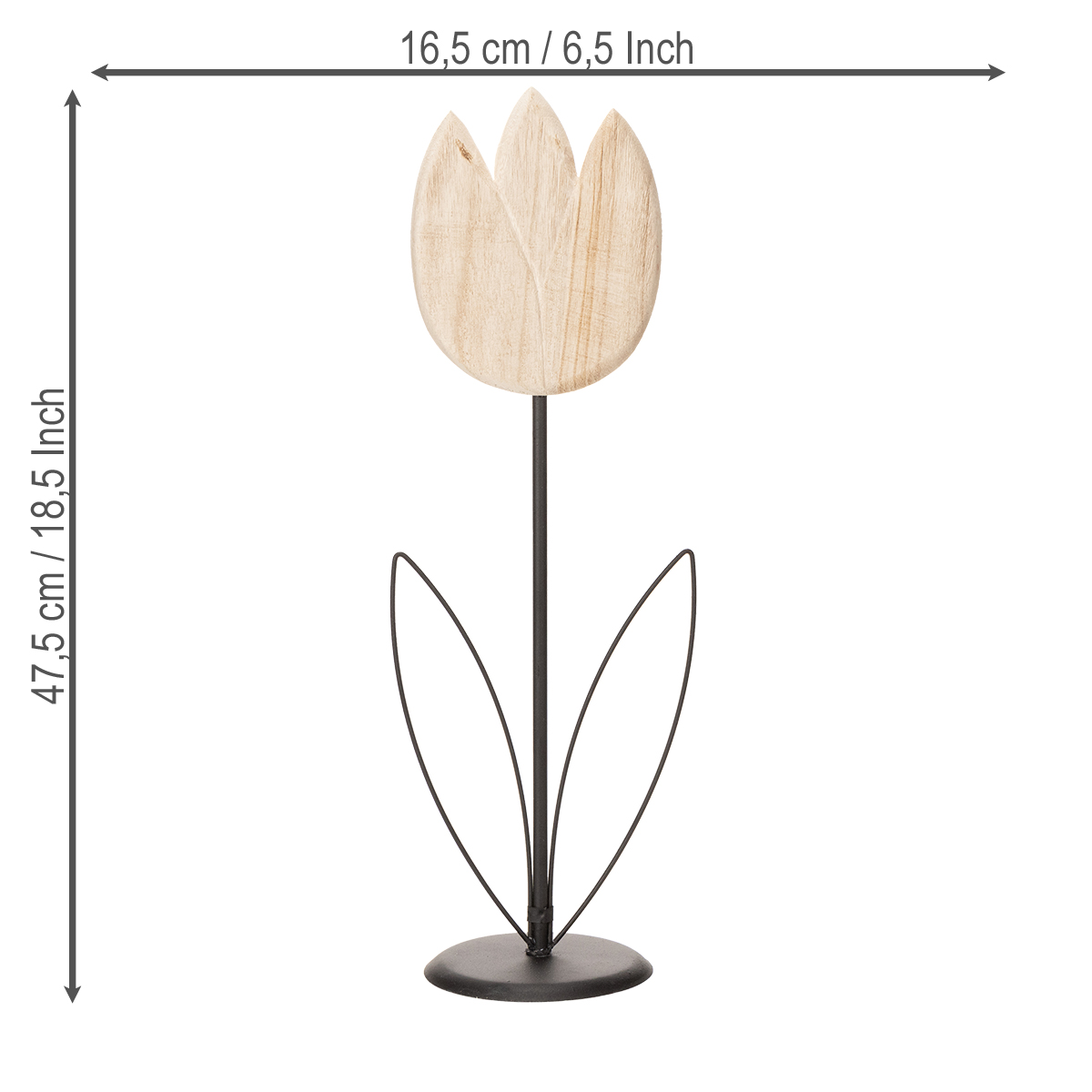 Ta figurka tulipana o wysokości 47,5 cm przyciąga wzrok, nie będąc jednocześnie nachalną. Czy to na parapecie, jako centralny element salonu, czy jako elegancki dodatek do przedpokoju – ten drewniany kwiat, dzięki swojemu kunsztowi wykonania, z pewnością przyciągnie wzrok. Naturalne drewno główki tulipana emanuje ciepłem, a delikatne, czarne, metalowe liście nadają figurce nowoczesny charakter. Wspaniałe połączenie natury i miejskiego szyku.