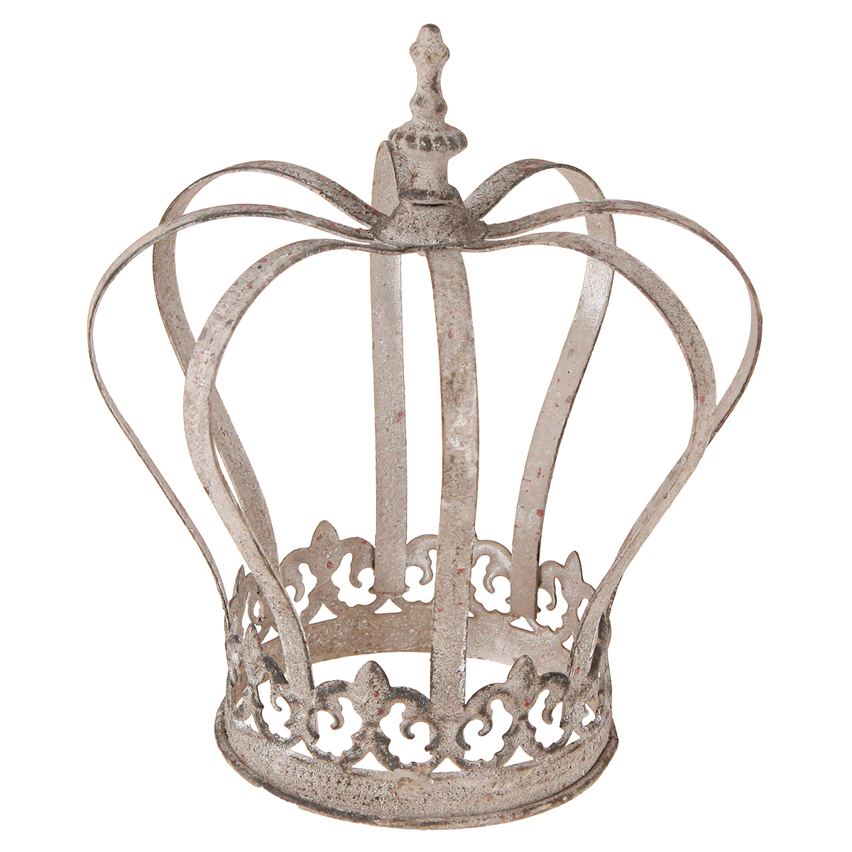Dzięki tej ozdobnej koronie Twoje kreatywne pomysły nie będą miały żadnych ograniczeń. Metalowa korona jest w kolorze szarym i miejscami ozdobiona rdzawym kolorem, co dodaje jej odrobinę stylu vintage i doskonale wpisuje się w modny styl shabby chic. Lekko wygięte paski zakończone są kwiatem lilii, który dawniej był herbem królów francuskich.