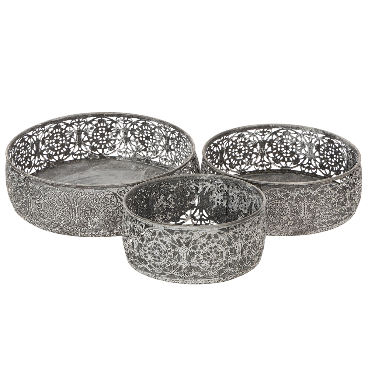 Ozdobione kwiatowymi wzorami, te metalowe ozdobne miski upiększają stoły, komody czy kredensy. Filigranowe wgłębienia tworzą urzekające zdobienia na zewnętrznej stronie metalowych muszli.