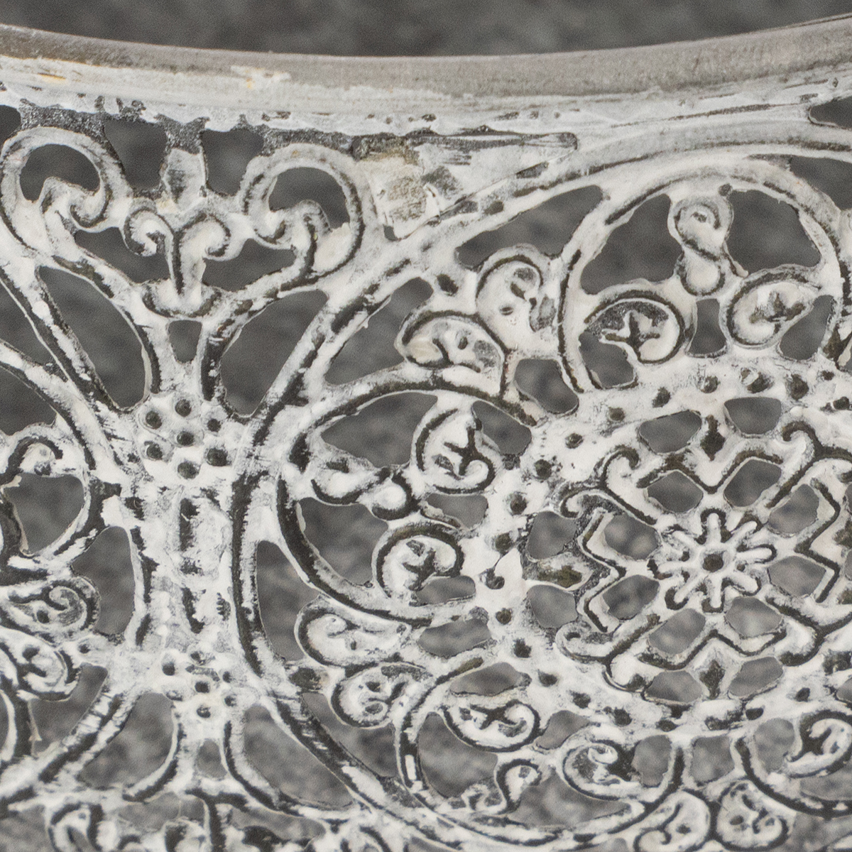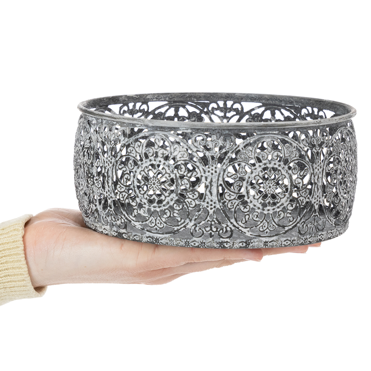 Kwiatowe wzory i ponadczasowa srebrna szarość sprawiają, że miska dekoracyjna z efektem sprania na biało jest wspaniałą dekoracją w stylu vintage.