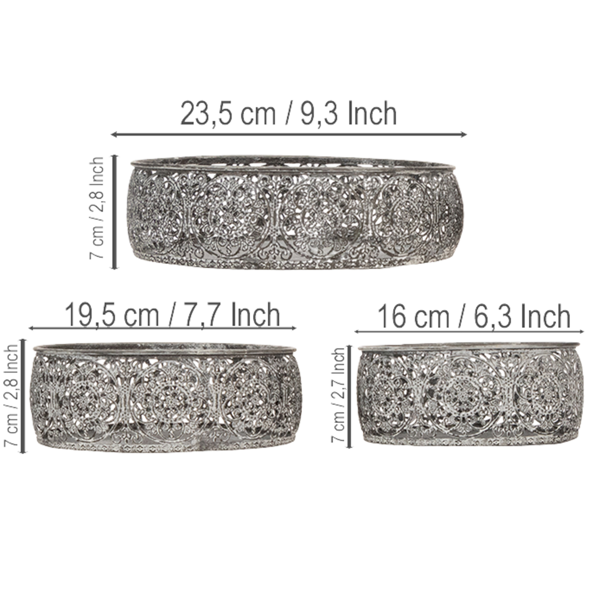 Trzy okrągłe miski o różnych średnicach można wykorzystać na różne sposoby do swoich pomysłów na dekorację. Srebrnoszary w połączeniu z białym washem wspaniale komponuje się z jasnymi lub szarymi kamieniami ozdobnymi, na których mogą stać białe lub antracytowe świece. Możesz również wykorzystać trzy ozdobne miski jako ozdobne schowki na swoje małe skarby.