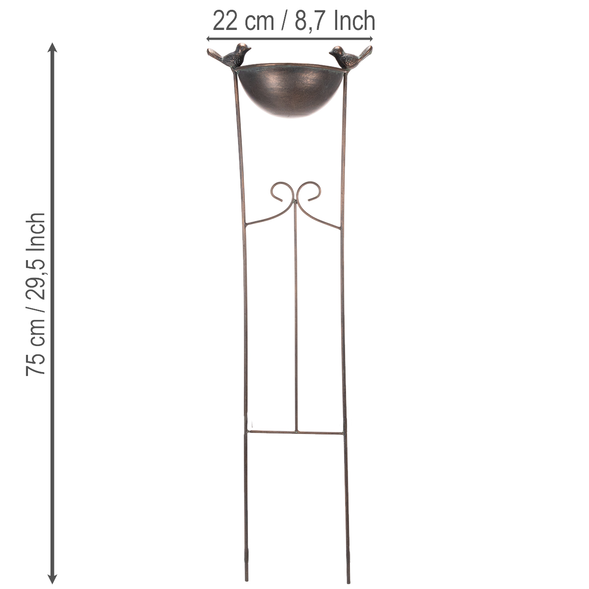 Ta ptasia kąpiel stylowo łączy funkcjonalność i design. Mierząca 75 centymetrów wysokości i 22 centymetry średnicy, z harmonijnymi, nostalgicznymi zdobieniami, ta dekoracja pięknie wkomponuje się w Twój ogród. Urocze metalowe ptaszki po bokach misy i kunsztowne pnącze podkreślają jej charakter vintage i nadają Twojemu ogrodowi baśniowy charakter. Użyj ptasia kąpiel jako praktycznego poidła dla ptaków lub jako donicy dla swoich najbardziej kreatywnych pomysłów. Szczególnie w cieplejszych miesiącach możesz zaaranżować kolorowe kwiaty, kamienie ozdobne lub rośliny pływające, aby stworzyć niepowtarzalny akcent ogrodowy. Dzięki kratownicy, ten dodatek idealnie nadaje się również do eleganckiej ekspozycji roślin pnących, takich jak powojniki czy bluszcz. Wysokiej jakości metalowa konstrukcja z eleganckim brązowym wykończeniem sprawia, że ptasia kąpiel jest warunkowo odporna na warunki atmosferyczne i nadaje jej wyjątkowo elegancki wygląd. Czyszczenie jest niezwykle proste: wystarczy opłukać misę czystą wodą, aby zachowała swój blask przez lata.