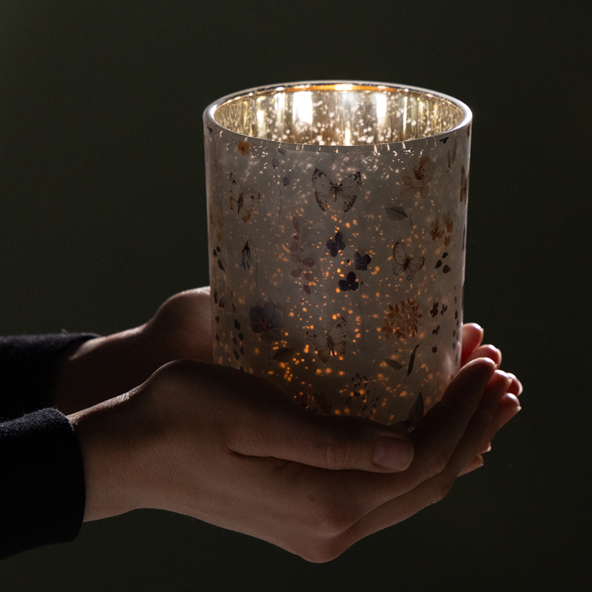 Ten świecznik przyciąga wzrok. Ma 8 cm wysokości i 7 cm średnicy, dzięki czemu idealnie rozprasza miękkie światło, nie przytłaczając go. Delikatny motyw motyla na szkle, w połączeniu z wewnętrzną, srebrną, odblaskową powierzchnią, tworzy magiczną grę światła i cienia, gdy zapala się w nim świecę. Dodaje odrobinę elegancji zarówno wnętrzom, jak i przestrzeniom zewnętrznym.