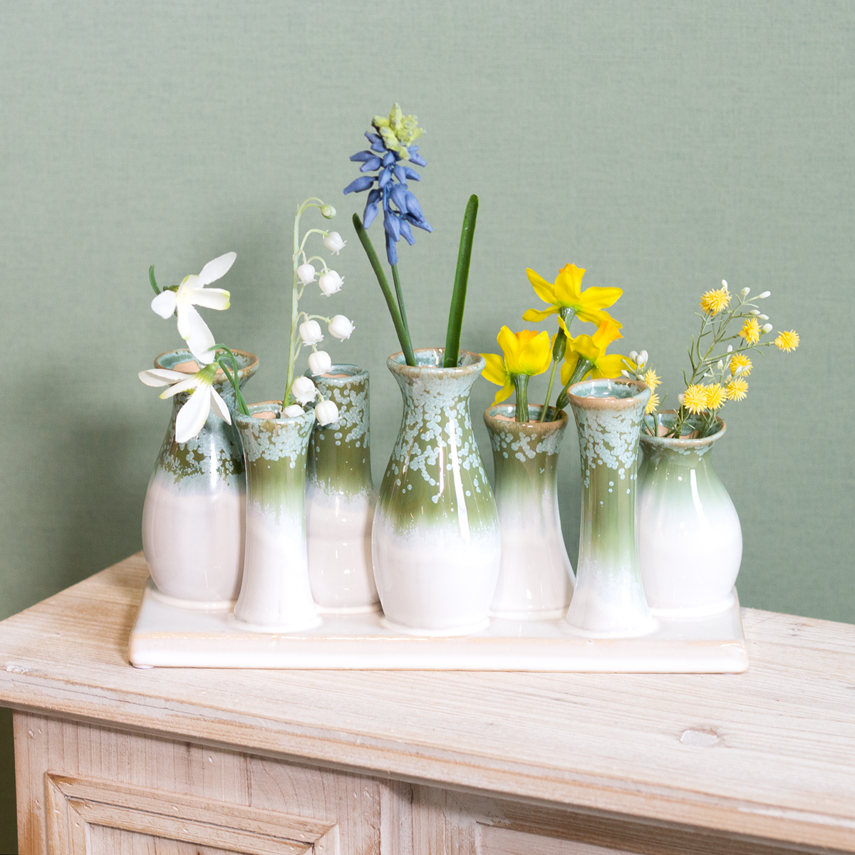 Ten zestaw siedmiu małych, dekoracyjnych ceramicznych wazonów na dopasowanej kolorystycznie tacy szybko stanie się ozdobą Twojego wnętrza. Harmonijne odcienie zieleni i bieli przywodzą na myśl naturalność skandynawskiego wzornictwa i idealnie komponują się z minimalistycznymi lub rustykalnymi stylami. Wazony mają różne kształty, co dodaje im wizualnego uroku w kremowym kolorze. Zestaw oferuje niezliczone możliwości aranżacji, niezależnie od tego, czy ułożone są w grupie, czy pojedynczo.