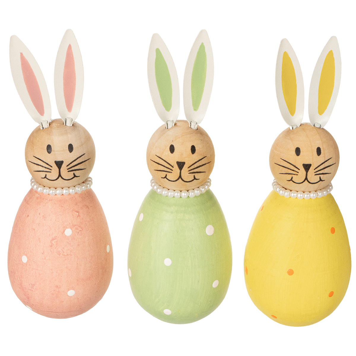 Te dekoracyjne figurki królików zachwycają od pierwszego wejrzenia uroczym designem i wysoką jakością wykonania. Wykonane z wytrzymałego drewna, są nie tylko trwałe, ale i ponadczasowo piękne. Połączenie naturalnych materiałów i stonowanych kolorów tworzy atrakcyjne połączenie uroku vintage z nowoczesną elegancją. Każdy królik ma niepowtarzalny design: pastelowe jajka zdobią subtelne kropeczki, a ruchome metalowe uszy i urocze perłowe naszyjniki dodają im wyjątkowego charakteru. Ręcznie malowane pyszczki królików ożywiają je i czynią z nich uroczą ozdobę każdego wnętrza. Figurki można doskonale łączyć z innymi dekoracjami, zwłaszcza na wielkanocnym stole – czy to z kompozycjami kwiatowymi, małymi koszyczkami wypełnionymi jajkami, czy innymi wiosennymi dekoracjami. Dodadzą również świeżości jako dekoracja parapetu lub jako pojedyncze elementy na półce. Ci, którzy cenią sobie wszechstronność, pokochają te figurki królików: równie dobrze pasują do rustykalnych, jak i klasycznych dekoracji wielkanocnych. Prezentują się szczególnie pięknie w połączeniu z innymi pastelowymi elementami, takimi jak delikatne świeczniki czy małe wazony z wiosennymi kwiatami. Twoja kreatywność nie ma granic!