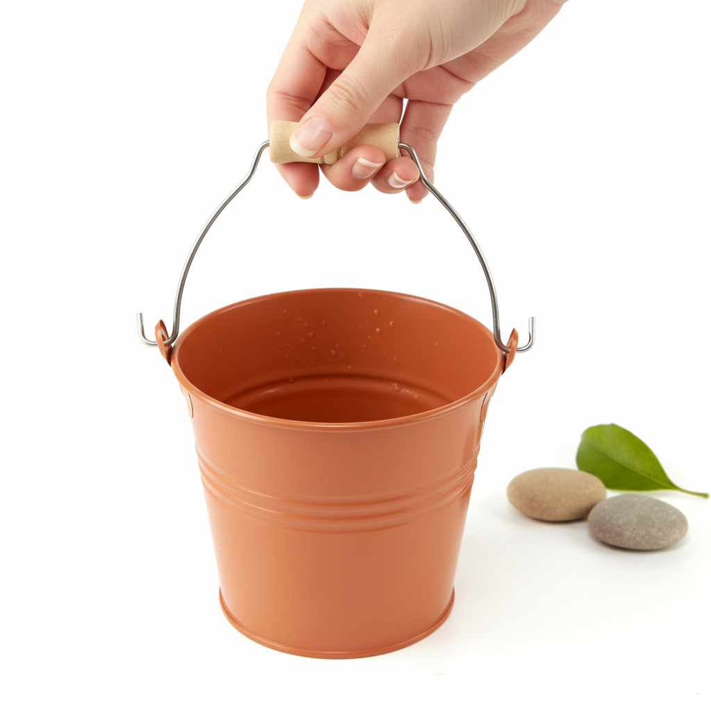 Oprócz klasycznego kształtu wiadro posiada ruchomą rączkę, do której, co stanowi atrakcję, przymocowana jest nieobrobiona, drewniana rączka. Dzięki temu dekoracyjna donica ma piękny wygląd w stylu vintage, który harmonijnie pasuje do każdego miejsca.