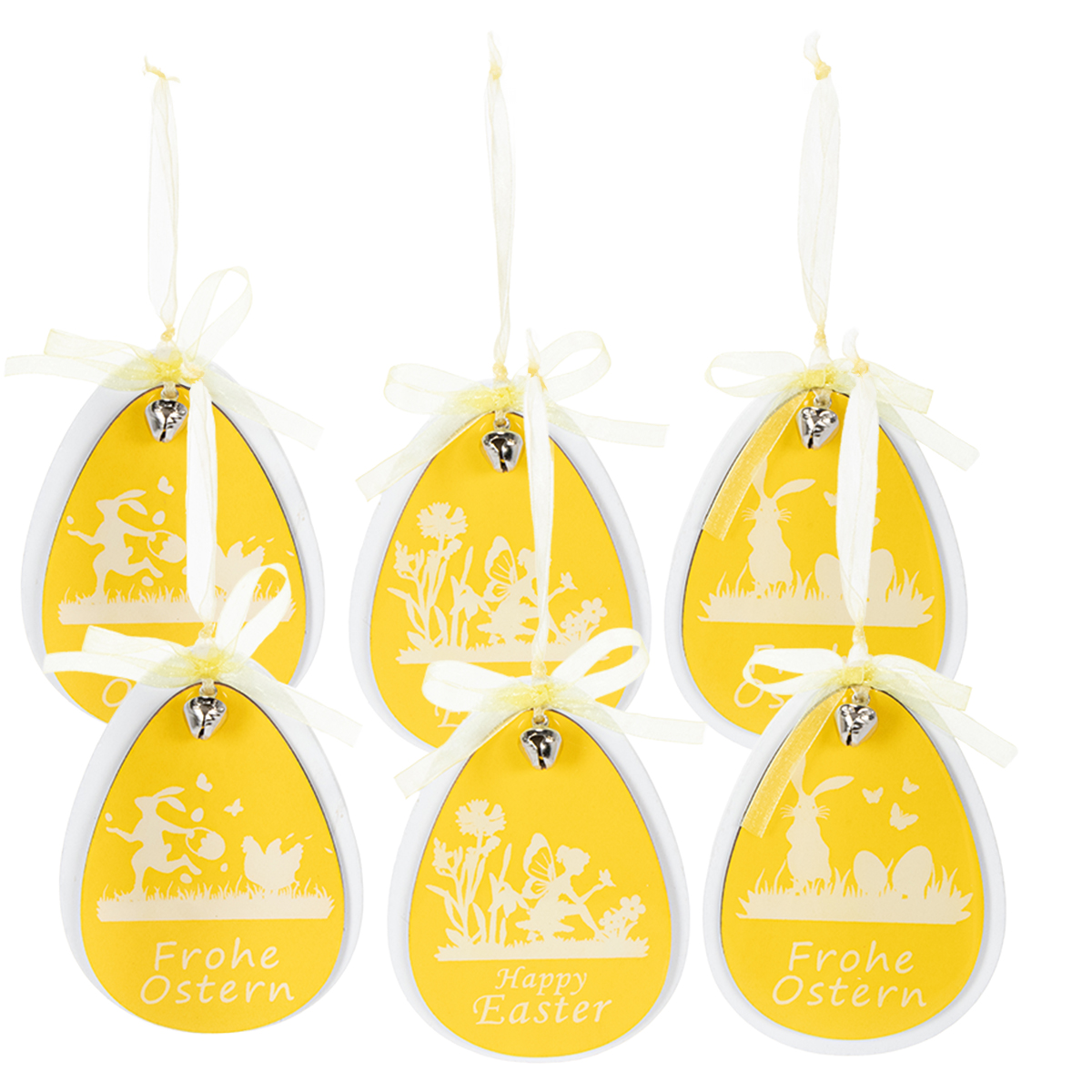 Dostaniesz 6 żółtych i białych jajek dekoracyjnych wykonanych z drewna do zawieszenia. Większe jajko ma wysokość około 11 centymetrów i szerokość około 8 centymetrów. Żółte jajko o wymiarach 9,5 × 7 centymetrów pozwala wystawać białemu. W komplecie przezroczysta żółta jedwabna wstążka, drewniana ozdoba wraz z zawieszką ma długość ok. 19 centymetrów.