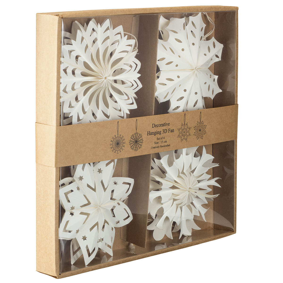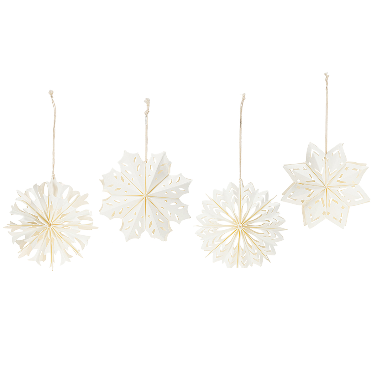 Nasze dekoracyjne papierowe płatki śniegu łączą styl, prostotę i praktyczność. Zestaw zawiera cztery różne płatki śniegu, każdy z ażurowym wzorem, który nawiązuje do niepowtarzalnego wyglądu prawdziwych płatków śniegu. Wykonane z wysokiej jakości, grubego papieru, zapewniają stabilność i elegancki wygląd. Zawieszenie ich jest banalnie proste dzięki dołączonemu bawełnianemu sznurkowi, a dzięki neutralnemu białemu kolorowi płatki śniegu pasują do niemal każdego stylu dekoracji.
