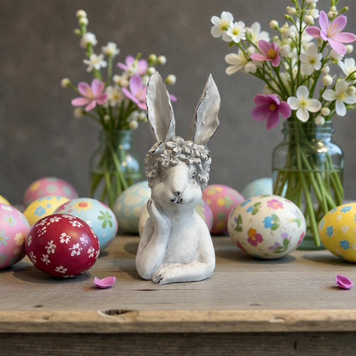 Nasz dekoracyjny królik zachwyca harmonijnym połączeniem dyskretnej elegancji i delikatnych detali. Wyrazista poza z podpierającą dłonią i figlarnym wieńcem kwiatowym na głowie nadają tej figurce wyjątkowego charakteru. Przyjemny szary kolor sprawia, że jest wszechstronny, a wysokiej jakości ceramika gwarantuje stabilność i trwałość. Nadaje się zarówno do wnętrz, jak i na zadaszone tereny zewnętrzne.
