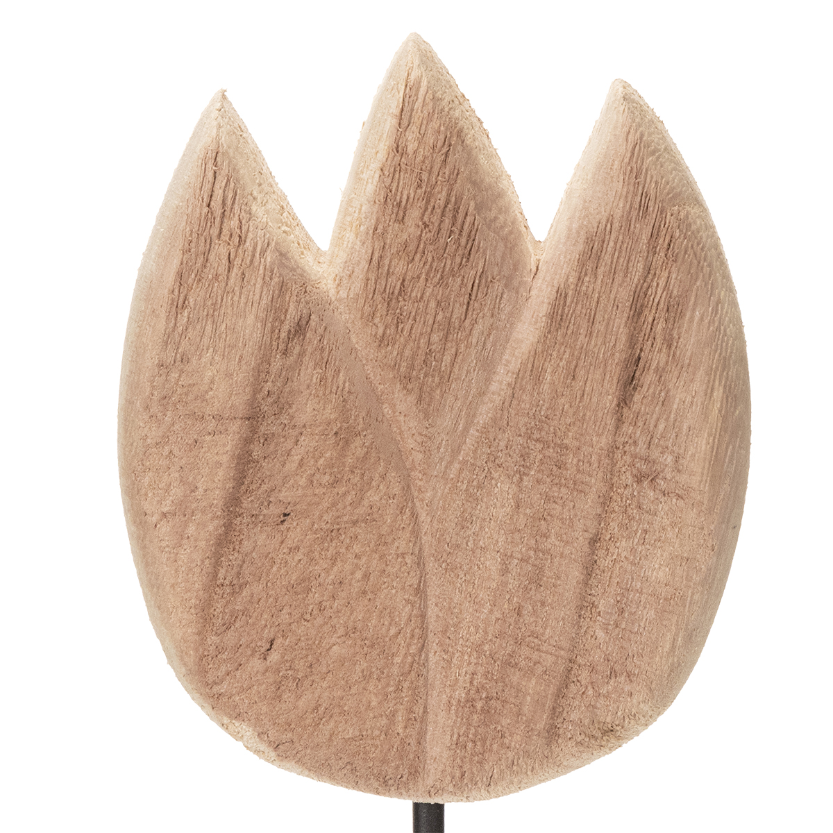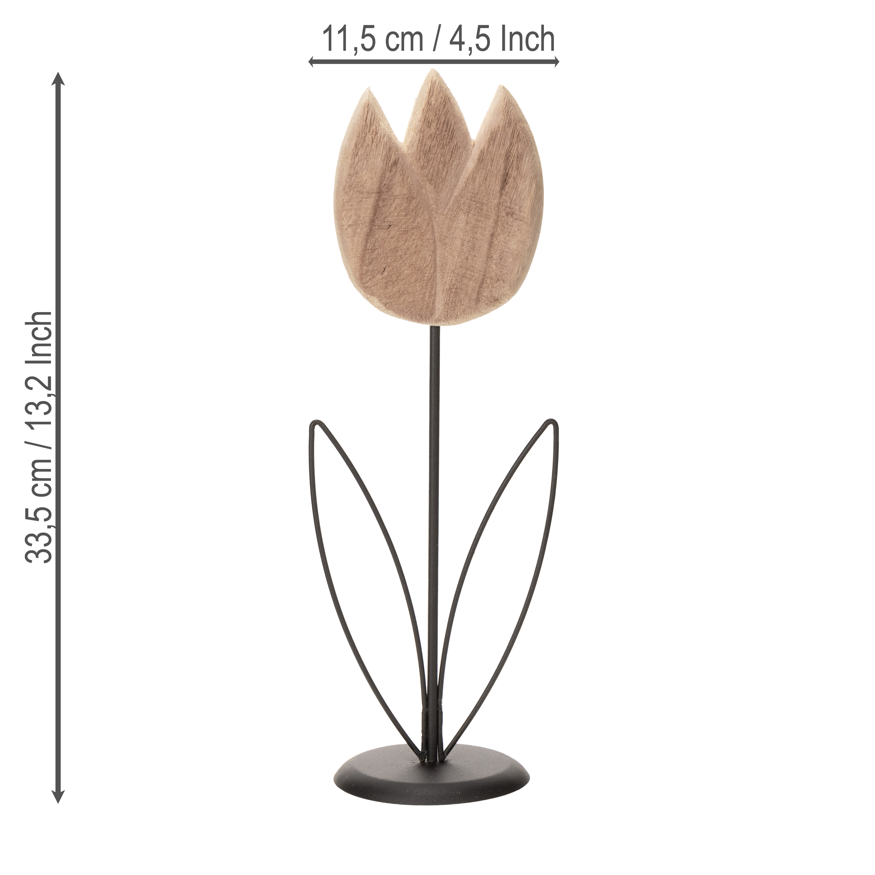 Ten dekoracyjny tulipan wyróżnia się prostym, a zarazem wyrazistym designem. Główka w kształcie tulipana wykonana jest z wysokiej jakości drewna, którego naturalne usłojenie nadaje mu wyjątkowo autentyczny wygląd. Liście, łodyga i podstawa wykonane są z wytrzymałego metalu, co zapewnia stabilność. Niezależnie od tego, czy preferujesz nowoczesny, skandynawski, czy ponadczasowy styl wnętrz, ten dekoracyjny tulipan idealnie wkomponuje się w każdą aranżację. Prezentuje się szczególnie pięknie w połączeniu z innymi elementami dekoracyjnymi z metalu lub drewna – na przykład w małej aranżacji ze świecami lub wazonami.