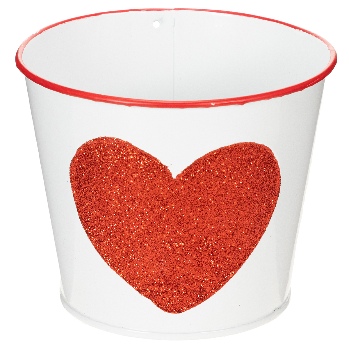 Śliczna mała doniczka o klasycznym wyglądzie. Białe blaszane wiaderko ma kształt filiżanki, ma czerwony brzeg i kształt czerwonego serca.