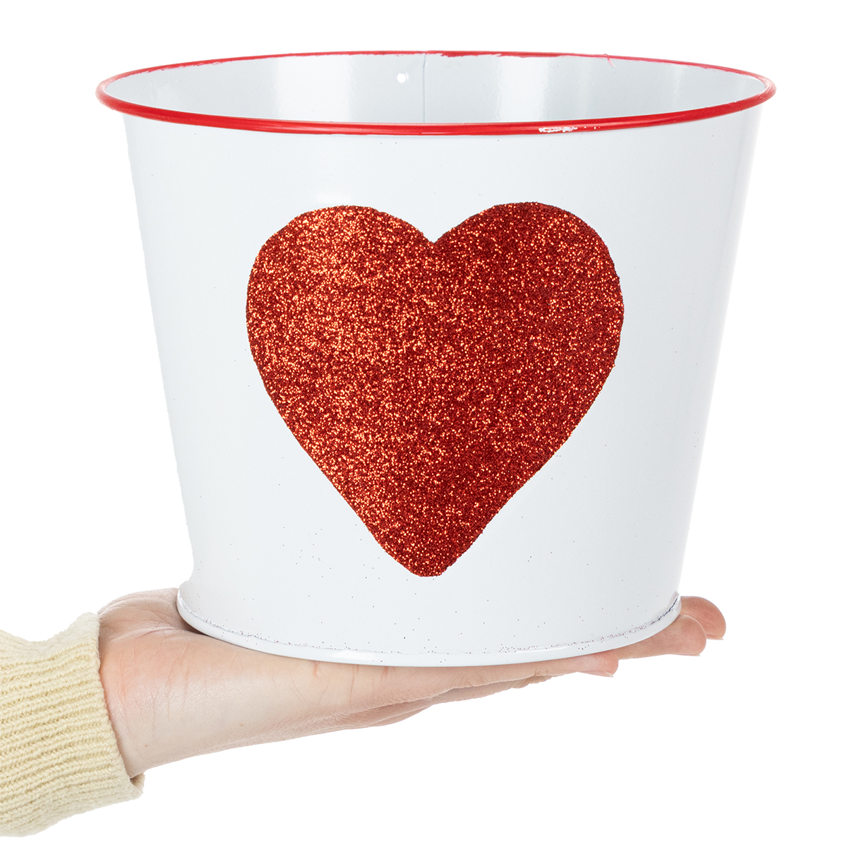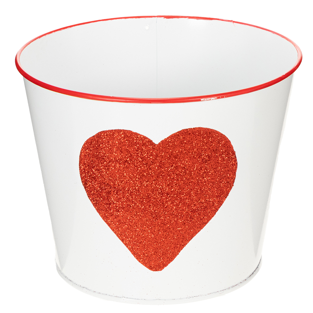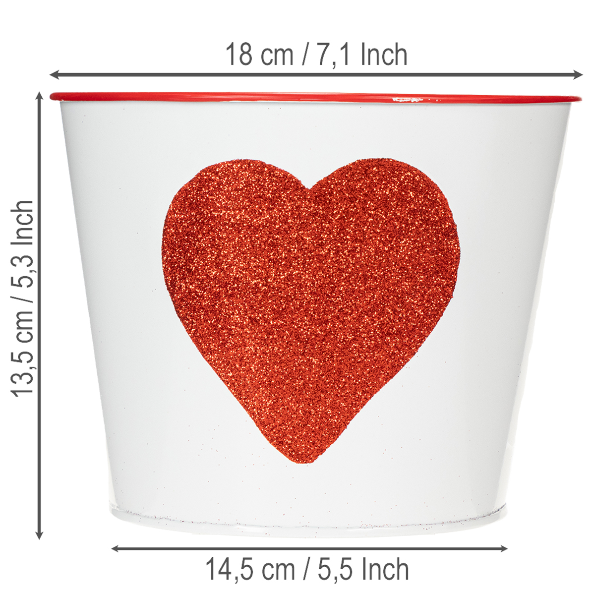 Ta doniczka o błyszczącym kształcie serca to idealna donica do podarowania storczyków w Walentynki. Białe blaszane wiaderko ma bardzo romantyczne serce z czerwonym brokatem i czerwoną obwódką pośrodku. Dzięki tak klasycznemu wzornictwu mama ucieszy się również z roślinki czy kwiatka na Dzień Matki.