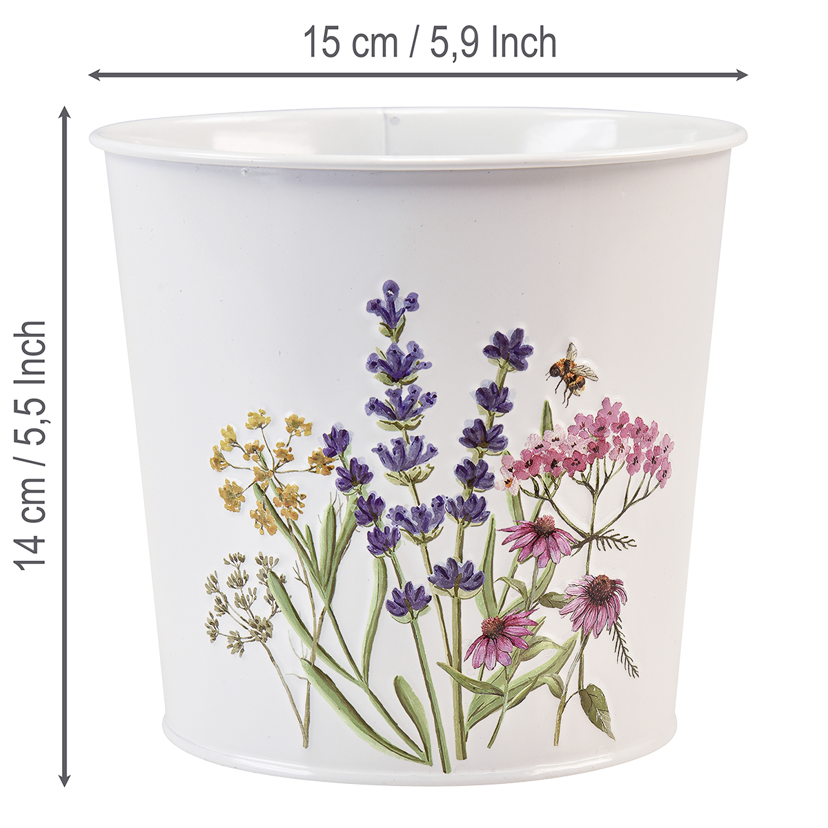 Ta piękna metalowa doniczka jest idealna jako doniczka do wiosennych lub letnich dekoracji! Prosta doniczka z białego metalu ozdobiona jest z jednej strony wytłoczonym motywem dzikich ziół z pszczołą, zabarwionym na naturalną kolorystykę.