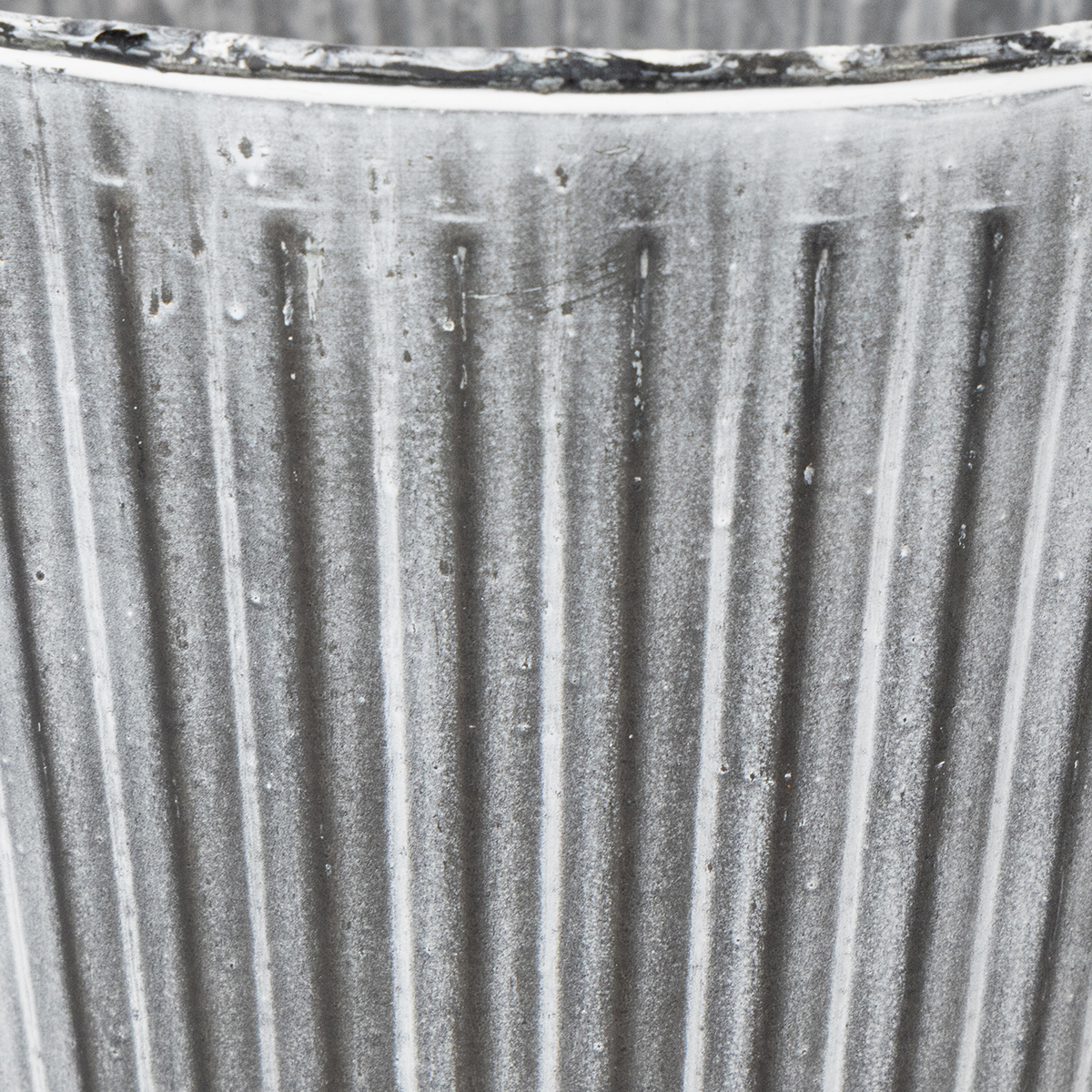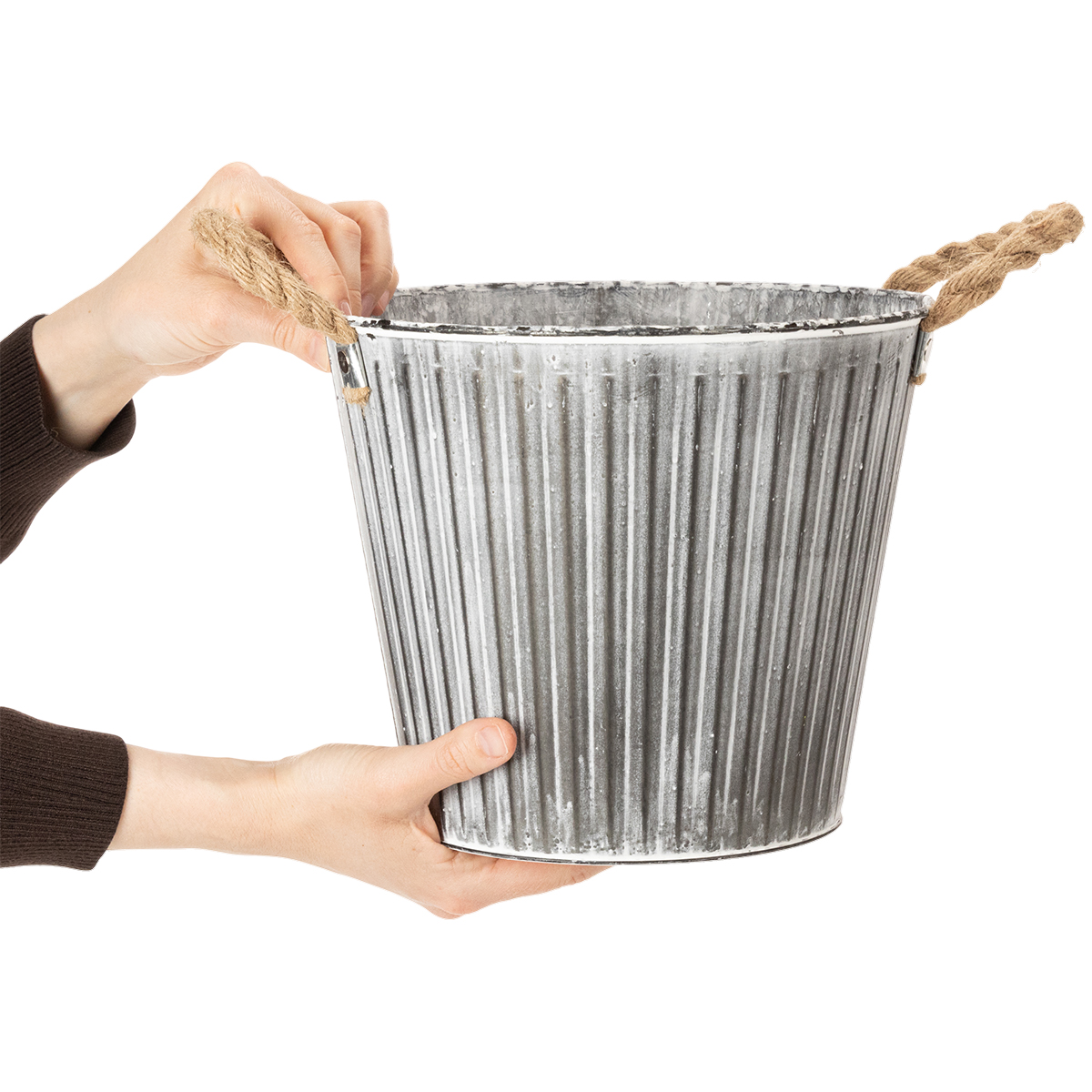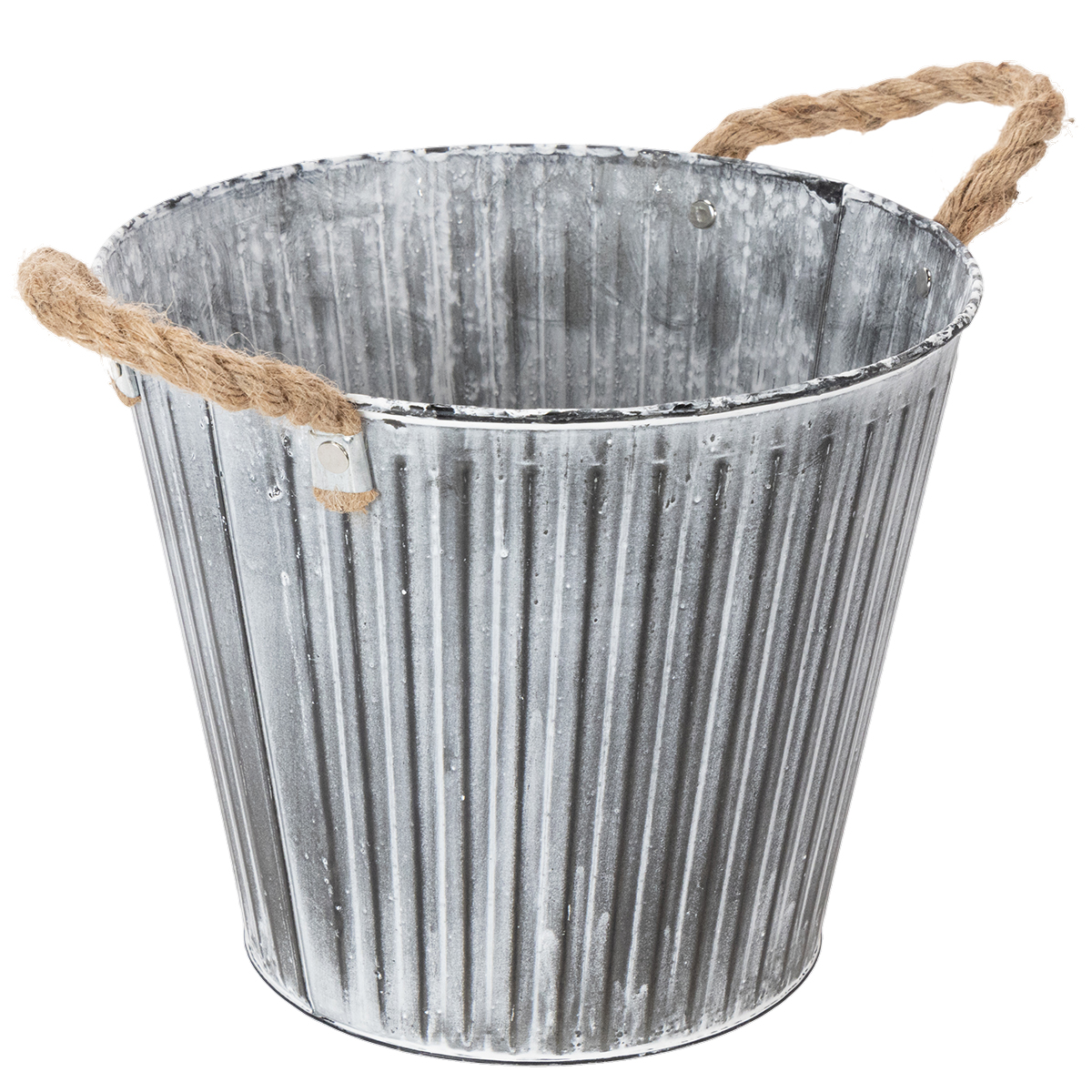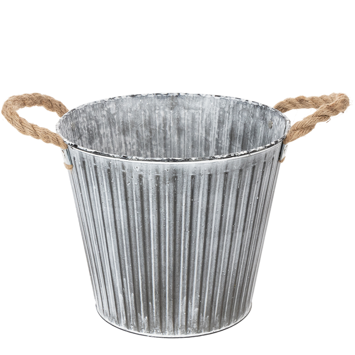 Ta sadzarka to wspaniała metalowa dekoracja w modnym stylu Shabby Chic! Pionowe linie tłoczenia dookoła, które zostały podkreślone kontrastującym białym praniem zdobią piękną dekoracyjną donicę z uchwytami wykonanymi z juty po obu stronach.