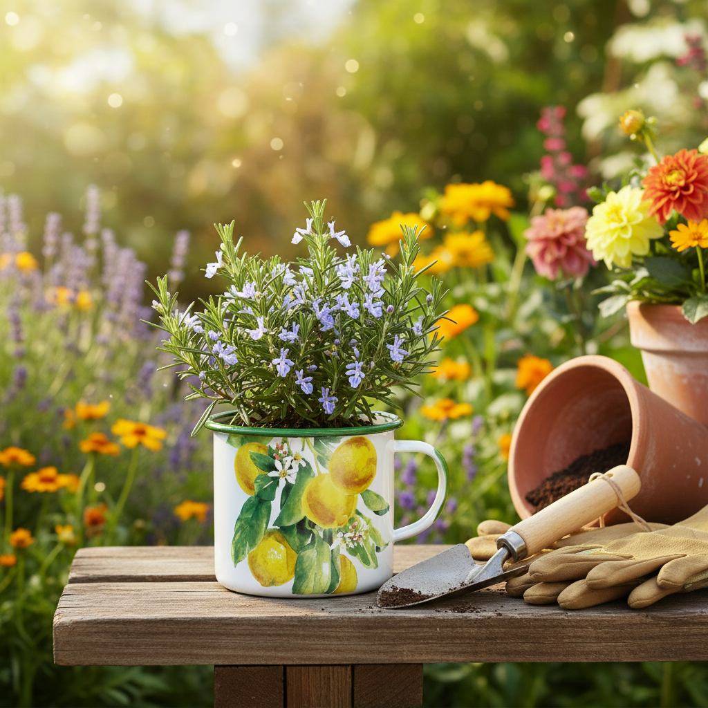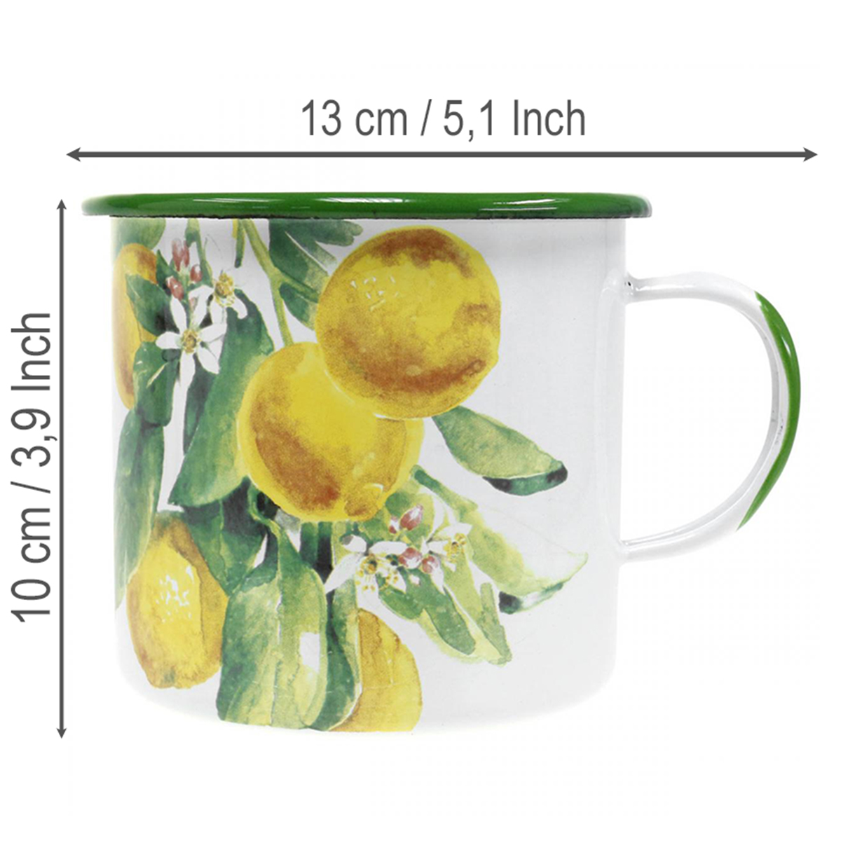 W tym emaliowanym kubku do doniczek możesz w bardzo elegancki sposób zaprezentować małe rośliny kwiatowe lub ziołowe. Dekoracyjna filiżanka z gałązką cytryny doskonale sprawdza się jako śródziemnomorski garnek!