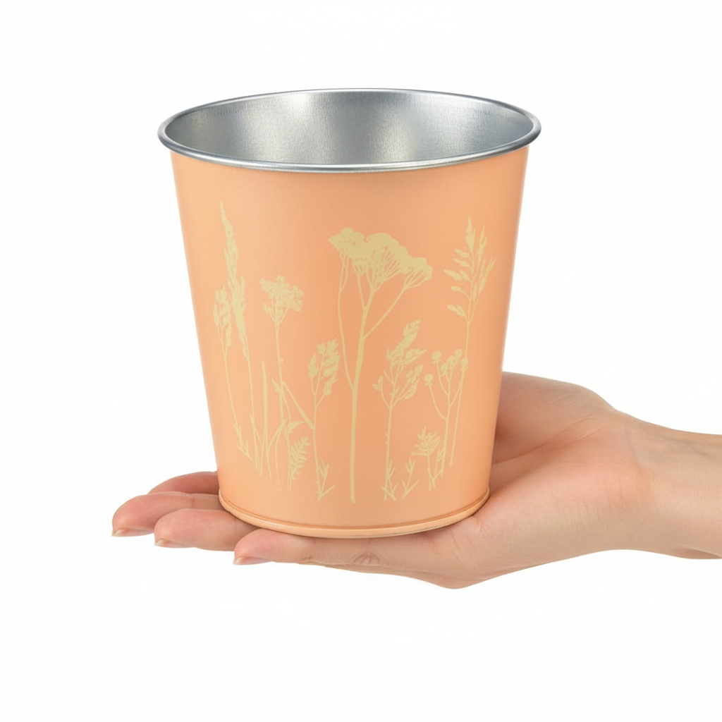Otrzymasz metalową doniczkę w kolorze brzoskwiniowym ze złotożółtym motywem ozdobionym po jednej stronie. Wewnętrzna podłoga mieni się srebrem i zachęca do wyposażenia i sadzenia.