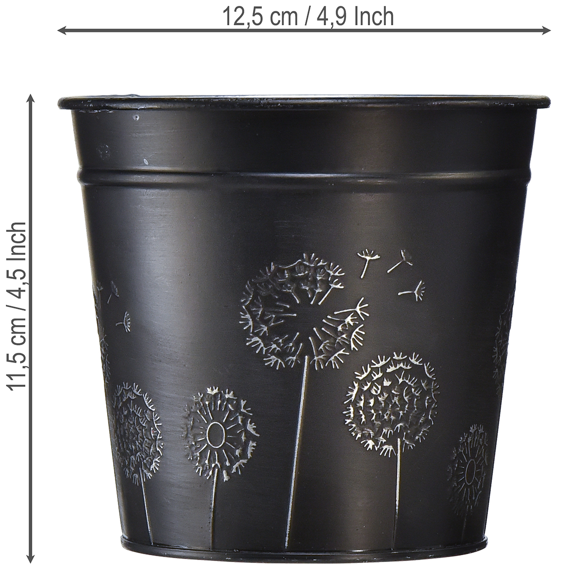 Ta czarna doniczka ma srebrną dekorację, która sprawi, że poczujesz się jak latem. Mniszek lekarski występuje w różnych rozmiarach i stadiach. A niektóre parasole już lecą do nowych miejsc.