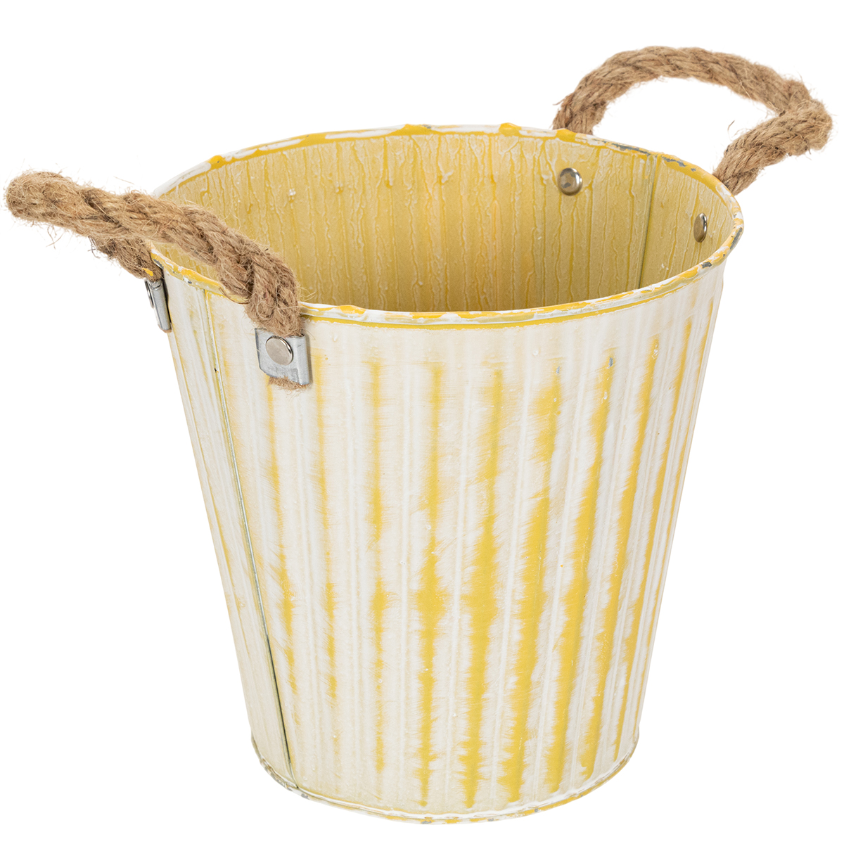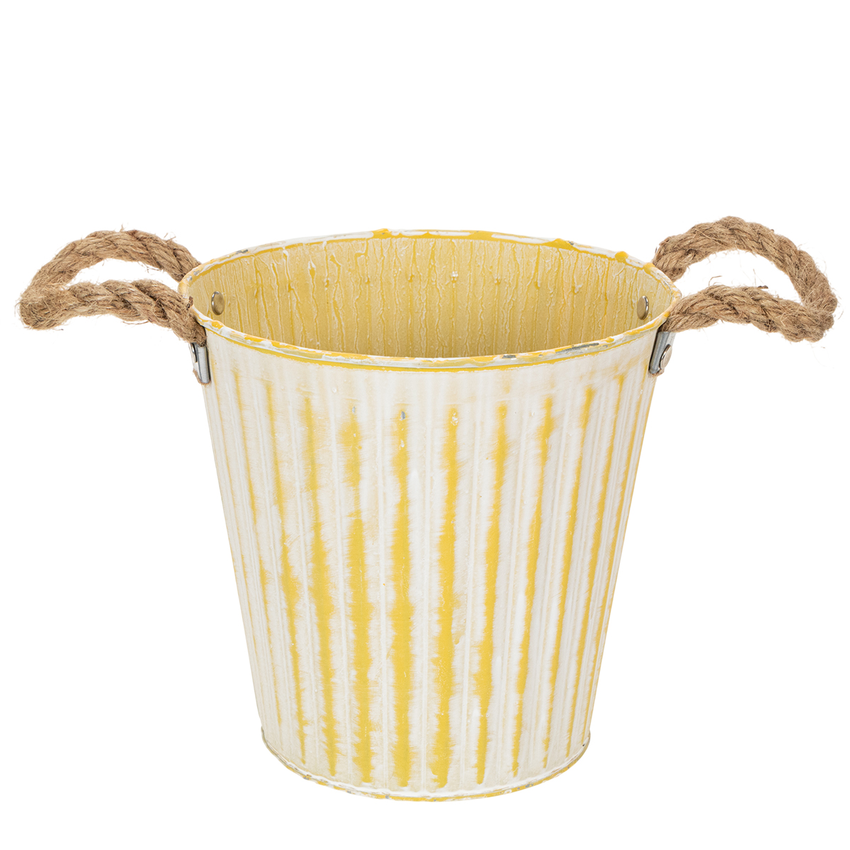 Ta metalowa doniczka idealnie nadaje się na wiosenne dekoracje: w pastelowej żółci, donica z uchwytami z jutowego sznurka jest sprana na biało w modnym shabby chic.