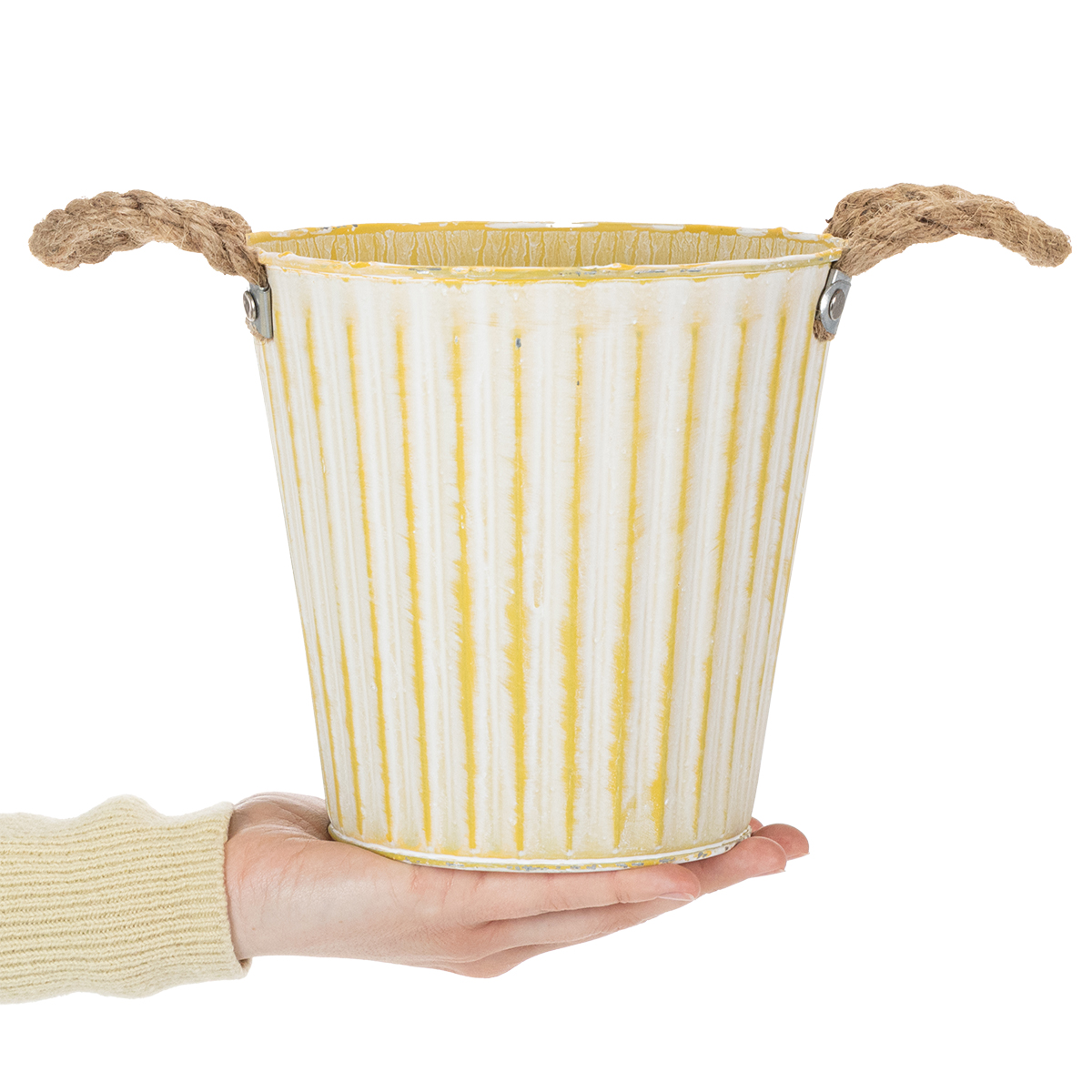Ta metalowa doniczka idealnie nadaje się na wiosenne dekoracje: w pastelowej żółci, donica z uchwytami z jutowego sznurka jest sprana na biało w modnym shabby chic.