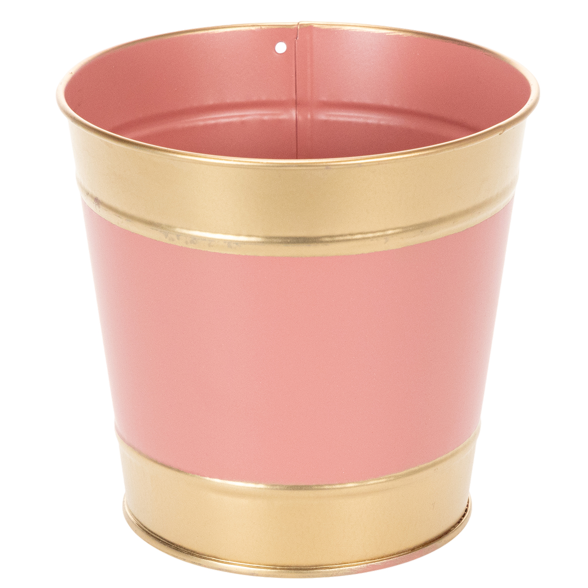 Doniczka ma kształt typowego blaszanego wiaderka z dodatkową złotą obwódką u góry iu dołu. Na środku pasek w jednym z czterech kolorów: brązowy, beżowy, różowy i brzoskwiniowy. Zestaw czterech jest skoordynowany kolorystycznie i można go tak wspaniale ustawić razem, na przykład na cokole z kwiatami.