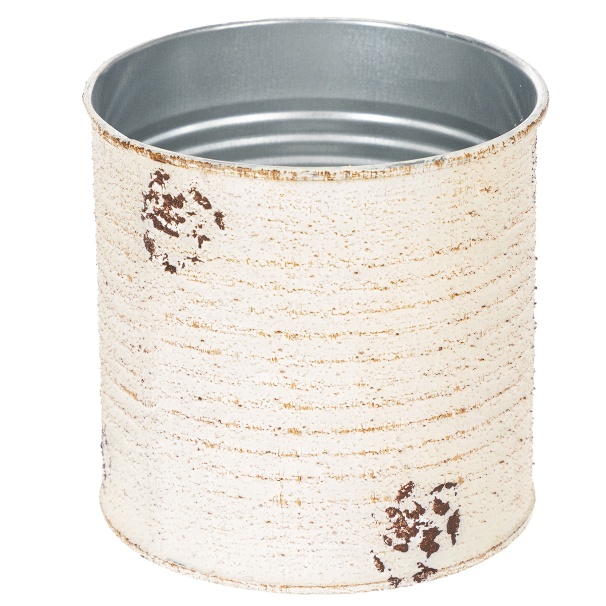 Urok z puszki: metalowy pojemnik w kremie emanuje przyjaznym shabby chic. Z zewnątrz puszka wygląda romantycznie zardzewiałą jak doniczka: dwukolorowe malowanie i celowe usuwanie górnej warstwy farby z rowków puszki daje wrażenie zardzewiałej dekoracji w stylu vintage. Z drugiej strony wnętrze naczynia jest srebrne.