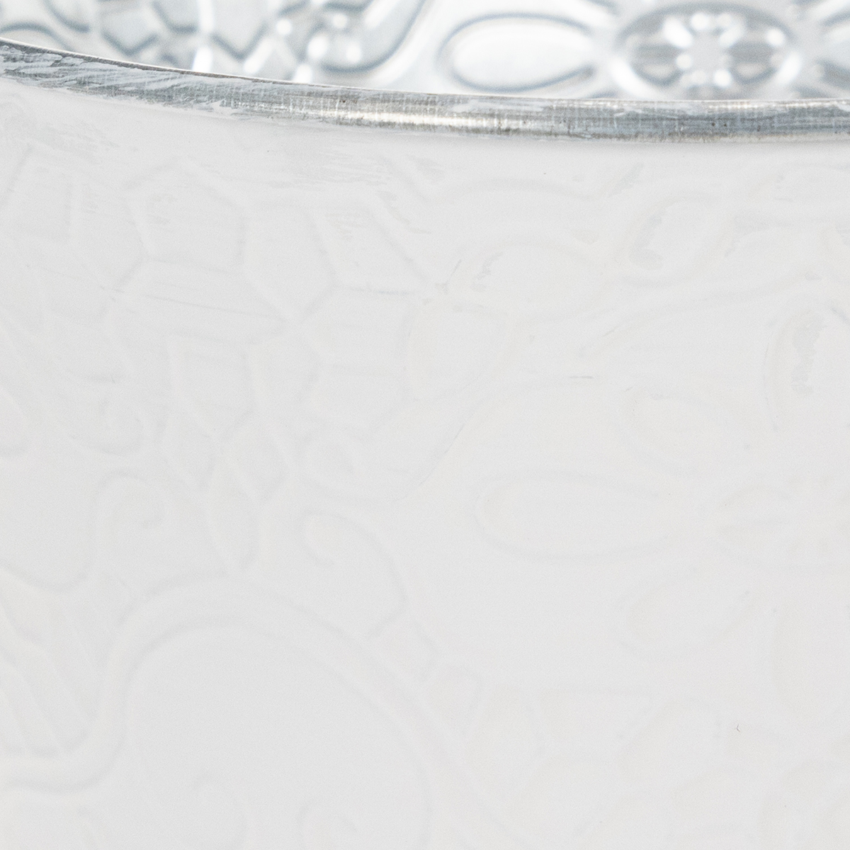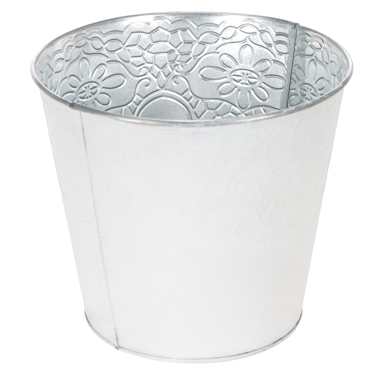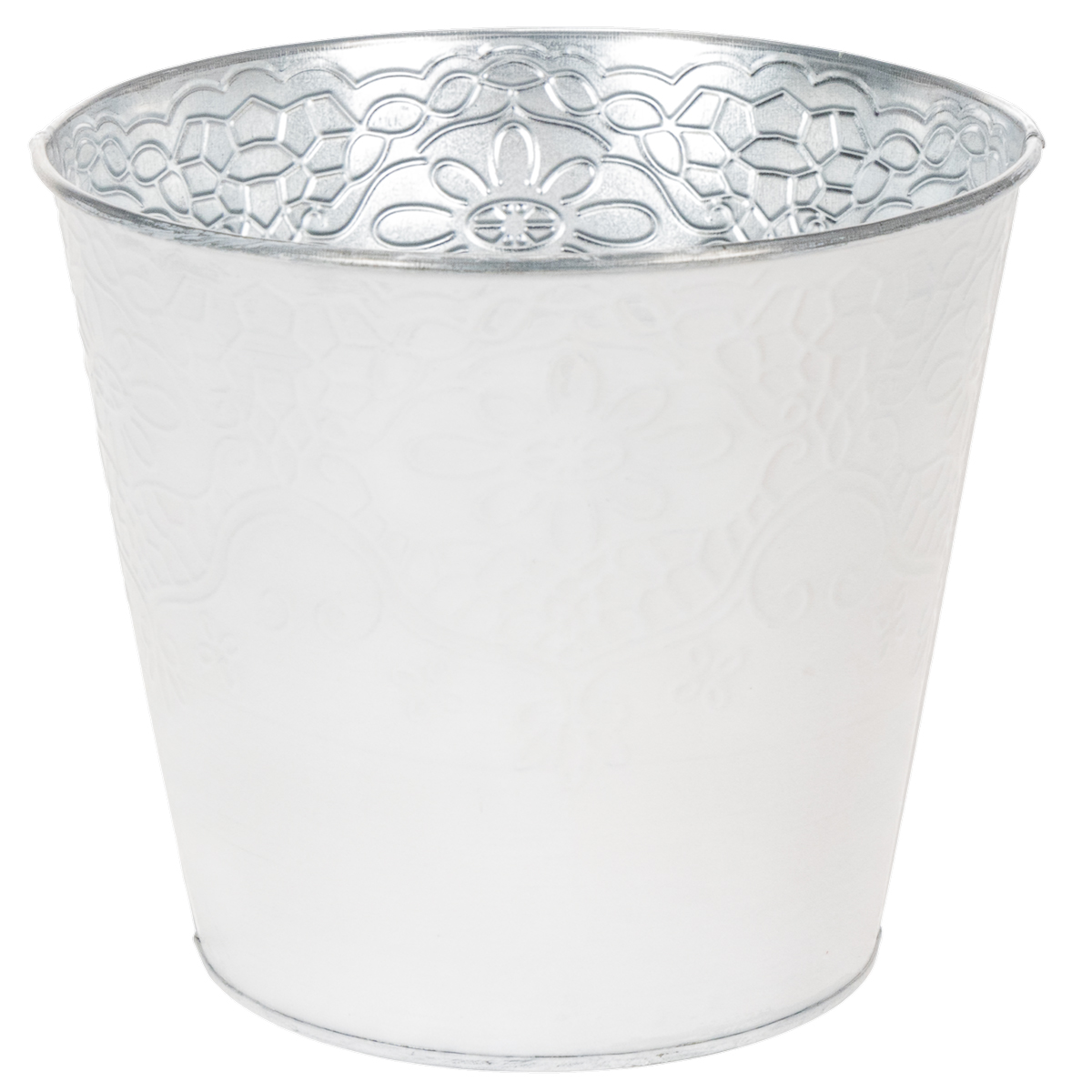 Szczegółowy wzór wąsów i kwiatów zdobi metalową donicę jako tłoczenie. W połączeniu z pastelowym białym malowaniem na zewnątrz tworzy to cudownie nostalgiczną wiosenną doniczkę!