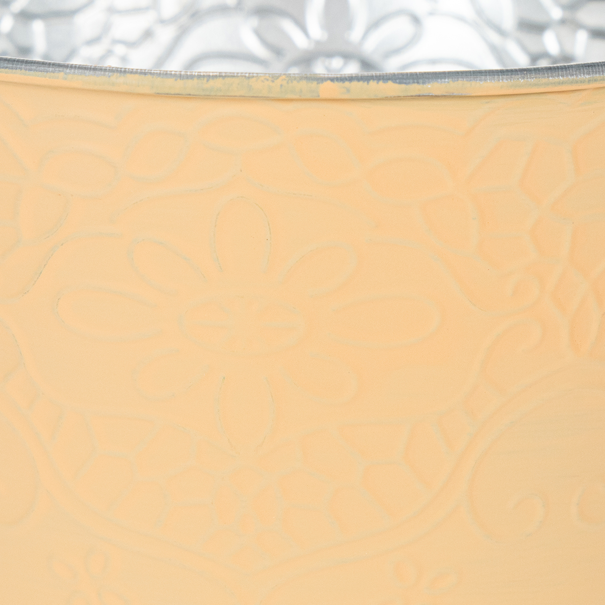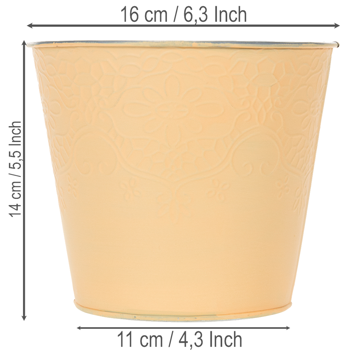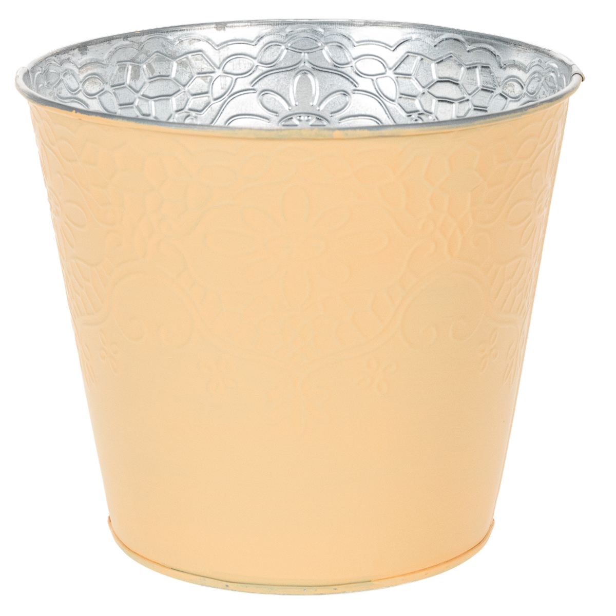 Wzór jest szczegółowo wytłoczony z motywami wąsów i kwiatów i doskonale prezentuje się na doniczce. Pomalowana na pomarańczowo obudowa kontrastuje z surowym, metalicznie srebrnym wnętrzem z ocynkowaną podstawą.