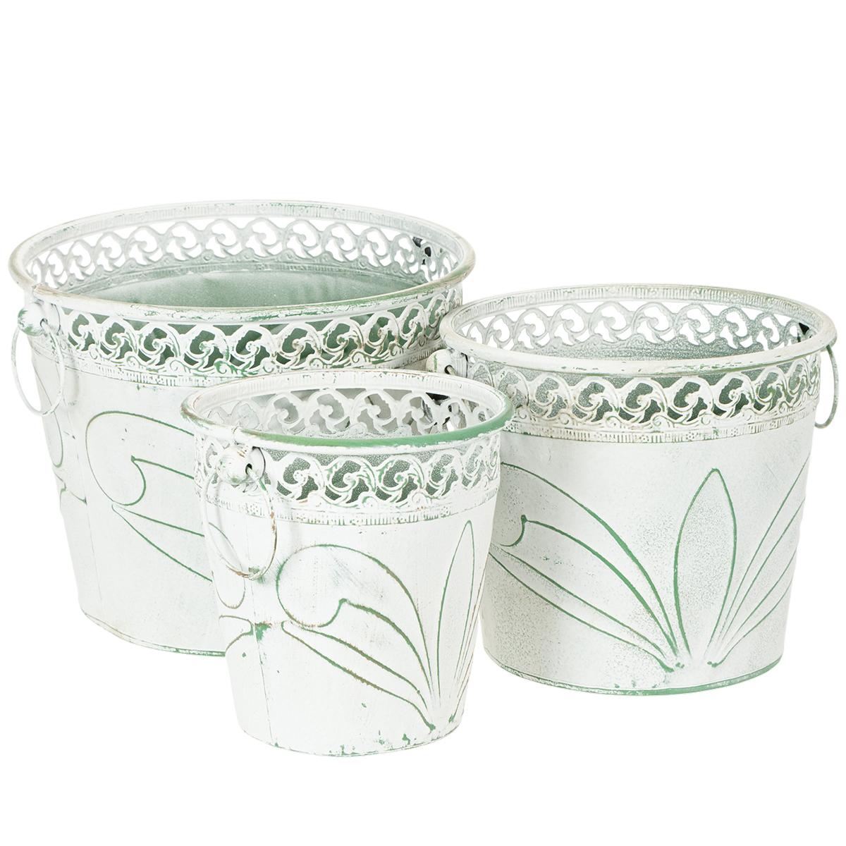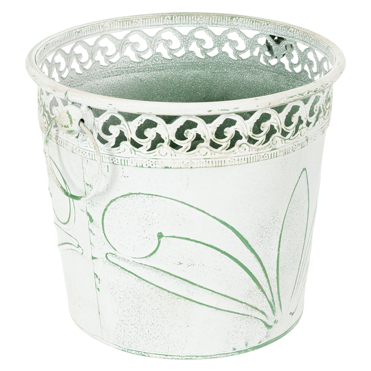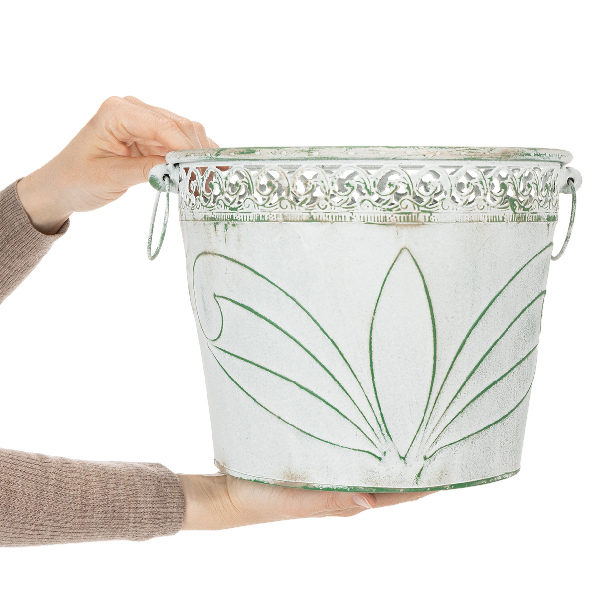 Te tłoczone blaszane wiaderka inspirują z jednej strony wytłoczonym motywem kwiatowym i wielką dziurkowaną krawędzią wykonaną z wąsowych ozdób. Dodatkowo donice z uchwytami w kolorze zielonym i białym zostały zaprojektowane w modnym stylu shabby chic, co nadaje im wspaniały antyczny wygląd.