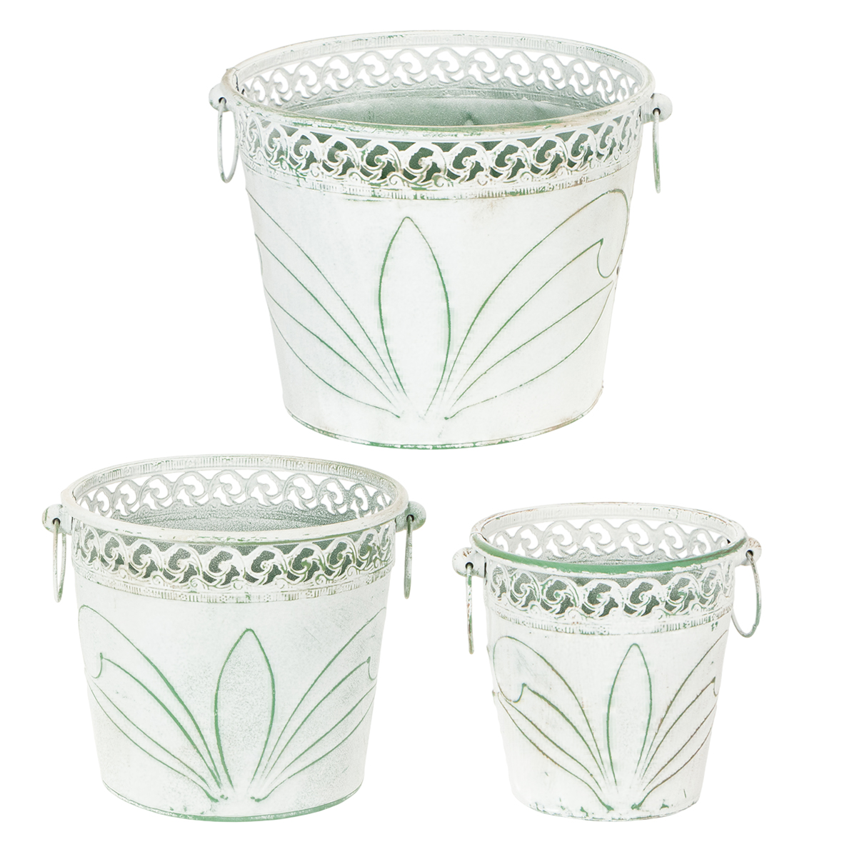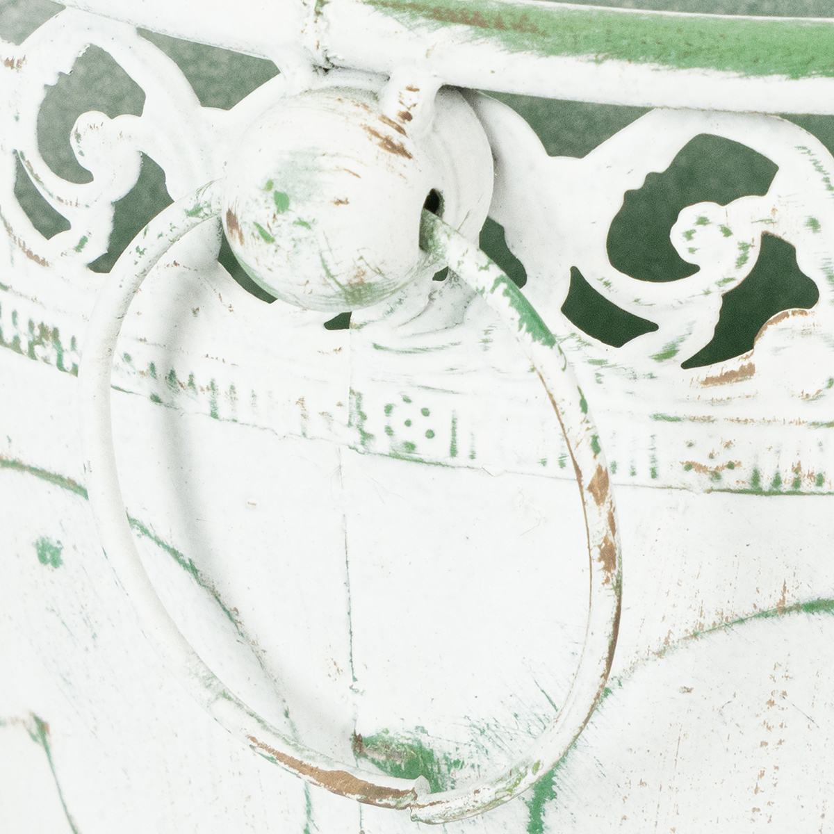 Doniczka metalowa z tłoczonym wzorem i uchwytami, biało-zielona, w stylu shabby chic, wys. 22/19,5/17,5 cm, śr. 25,5/20,5/15,5 cm, zestaw 3 szt.