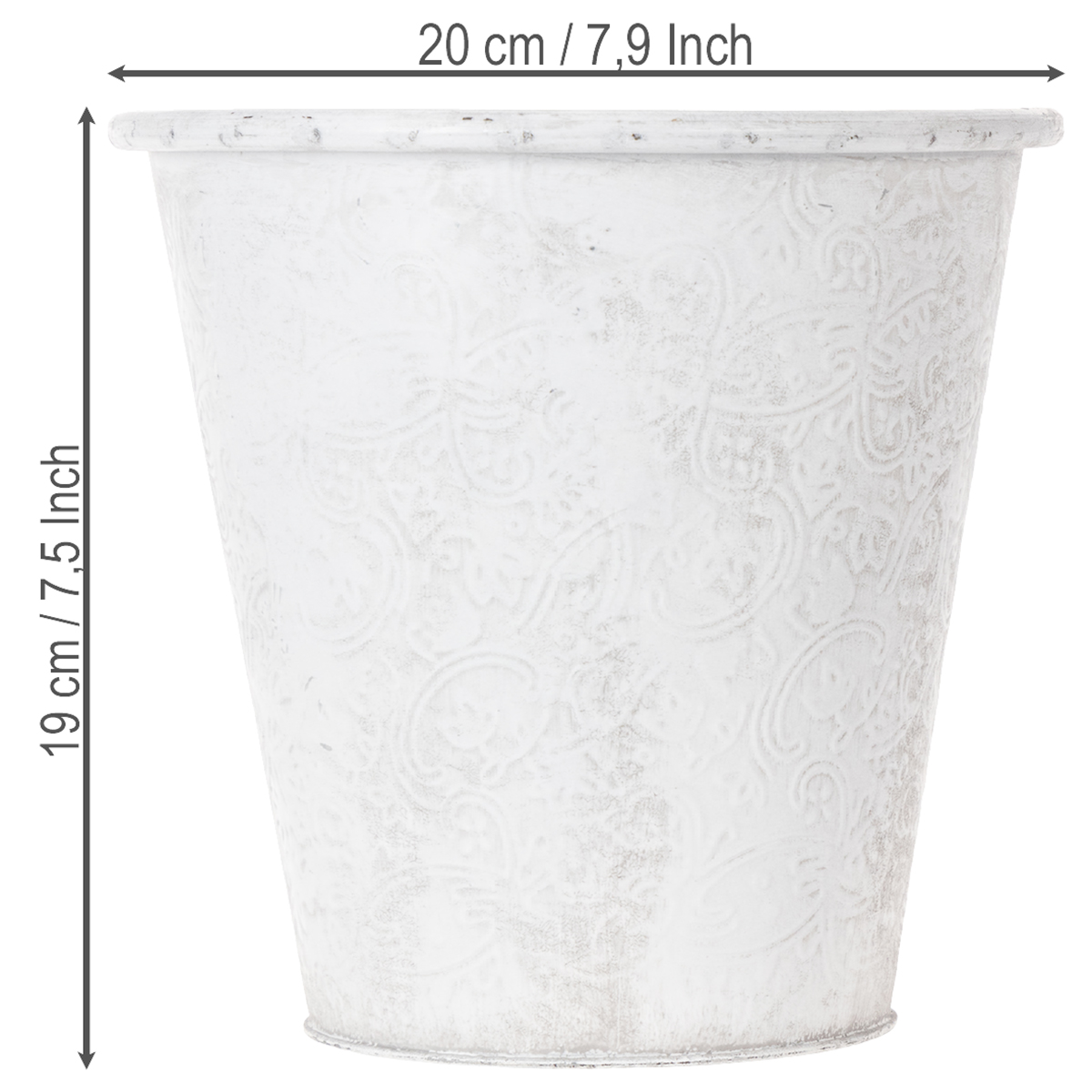 Bajkowa kryjówka jest ozdobiona ornamentami: metalowa ozdoba jest wytłoczona dookoła kwiatowymi kwiatami. Dzięki romantycznemu wyglądowi i bieli w modnym shabby chic, metalowe naczynie wspaniale pasuje również jako dekoracja stołu w stylu vintage na ozdobę kwiatową na wesele!