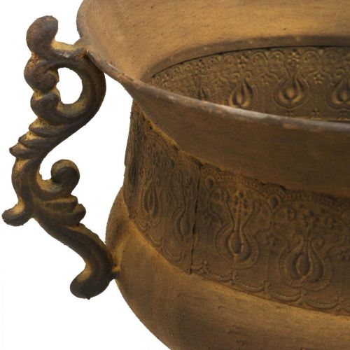 Imponująca donica z rdzy wnosi do wszystkich dekoracji antyczną atmosferę. Ze względu na wyszukany wygląd rdzy, ten szczególnie duży wazon kielichowy natychmiast przyciąga wzrok. Dodatkowo miseczka jest ozdobiona wzorami wzorowanymi na klasycznych modelach oraz posiada ozdobne uchwyty. Bez wątpienia donica to metalowa dekoracja z najwyższej półki!Wspaniała doniczka przyciągnie wzrok w ogrodzie na ścianie z kamienia naturalnego lub w pomieszczeniu.Wiaderko z rdzy nadaje się również do restauracji, stref wejściowych, hoteli i dekoracji witryn sklepowych na temat starożytności.