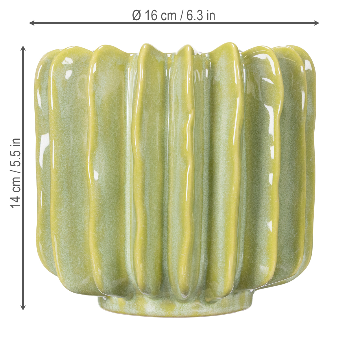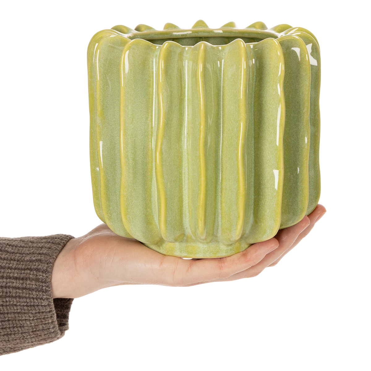 Co za przyciąga wzrok! Ta zielona doniczka z kaktusem nie tylko pięknie wygląda, ale także wnosi świeży, egzotyczny akcent do Twojego domu. Niezależnie od tego, czy jesteś fanem kaktusów, czy po prostu masz słabość do stylowych akcentów, ten element dekoracyjny Cię zachwyci. Harmonijny zielony kolor w połączeniu z unikalnym wzornictwem i wyrazistymi żłobieniami doda Twojemu wnętrzu wyjątkowego blasku. Wyobraź sobie, jak atrakcyjnie ta 16-centymetrowa ceramiczna doniczka będzie wyglądać na parapecie, półce w salonie, a nawet na biurku. Doskonale łączy styl i funkcjonalność.