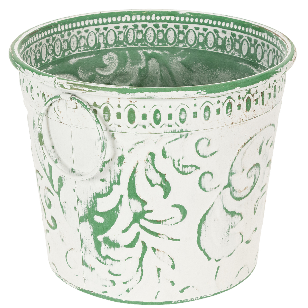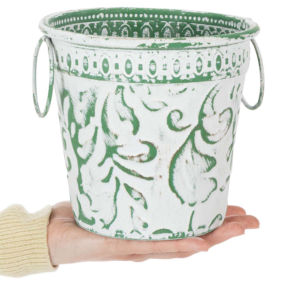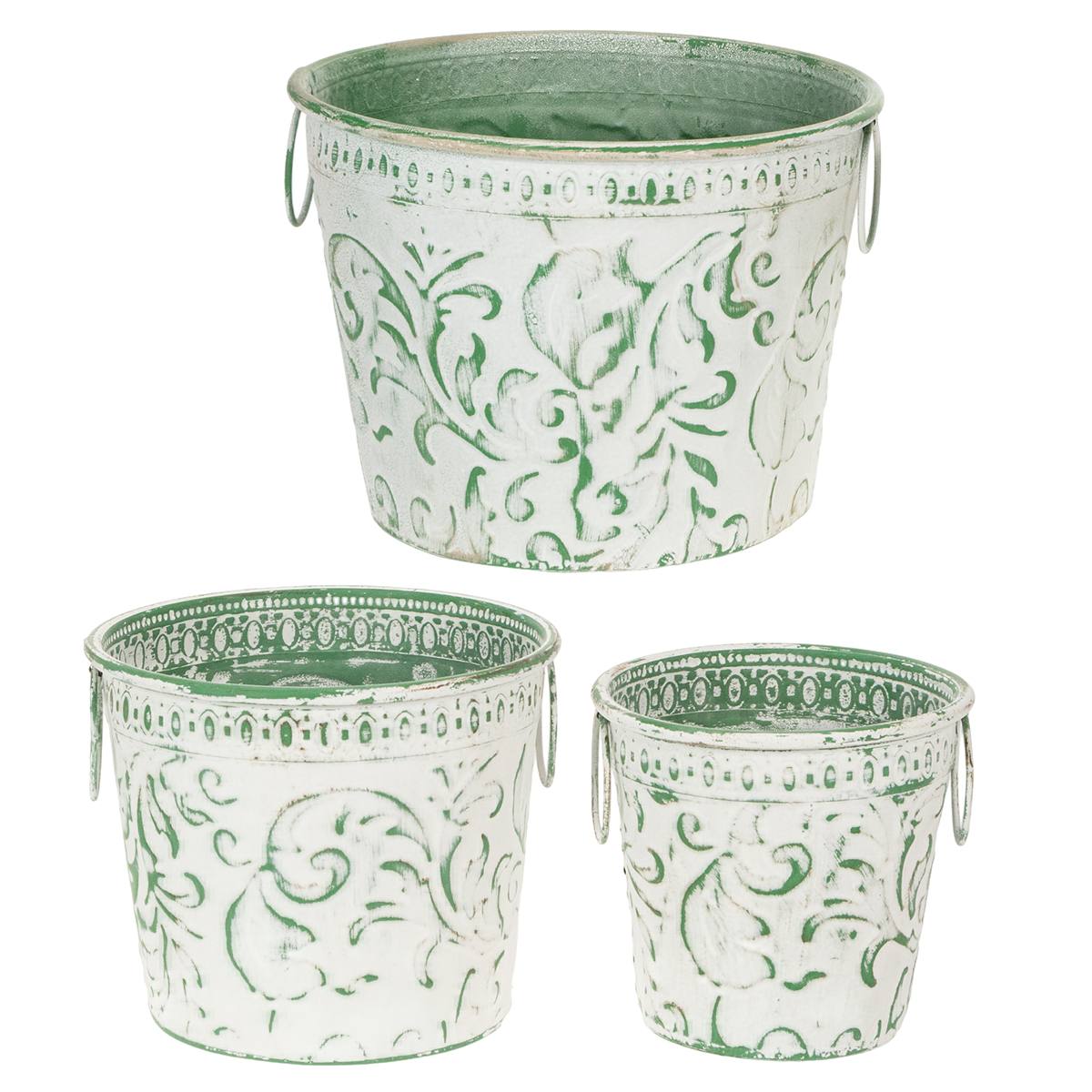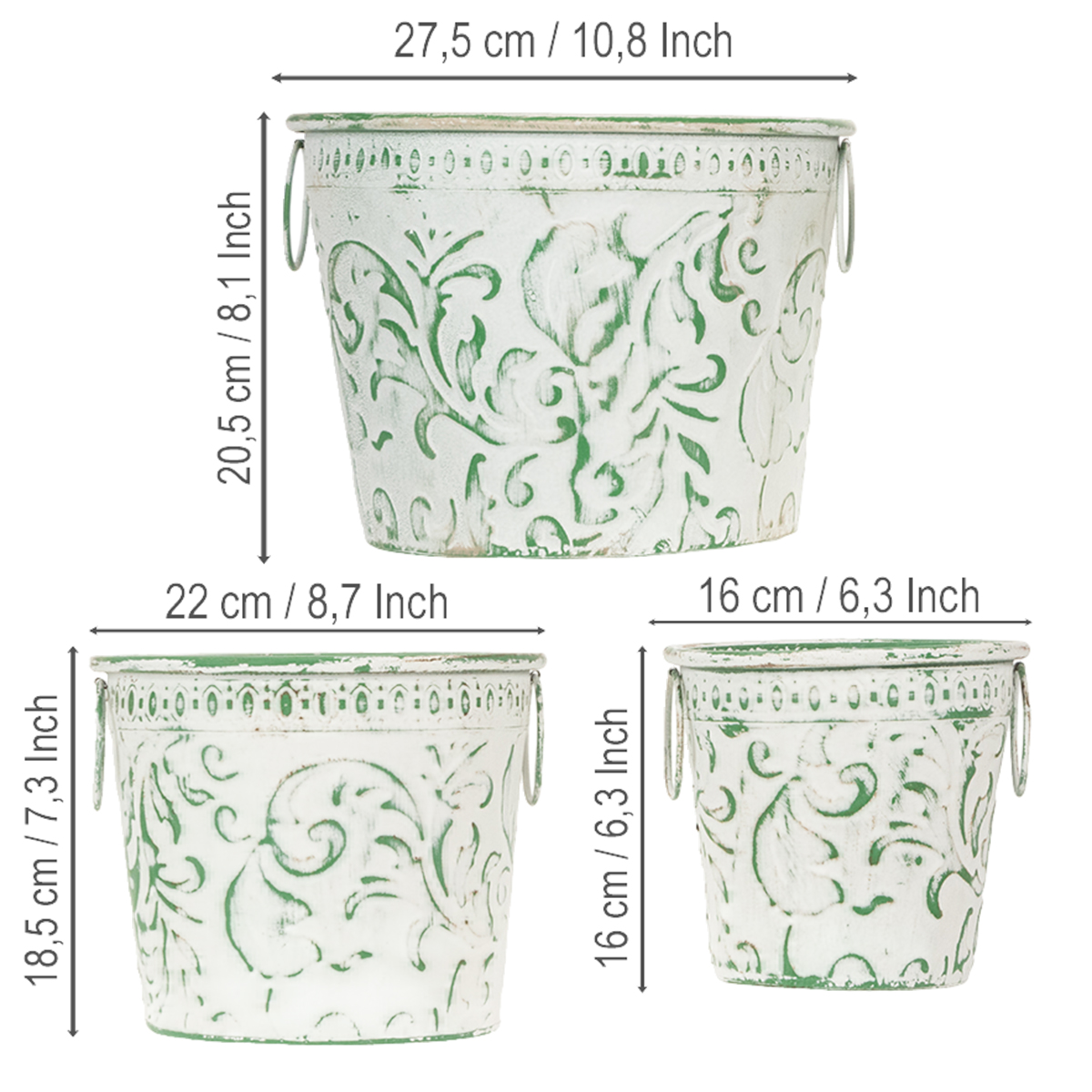 Te metalowe garnki z uchwytami są dostępne w praktycznym zestawie 3 sztuk! Rustykalne donice z tłoczeniem są zaprojektowane w modnym stylu shabby chic, dzięki czemu zielony lakier dekoracyjnych doniczek przebija się przez nieregularne białe rozmycie, zwłaszcza na krawędziach i wytłoczeniach.
