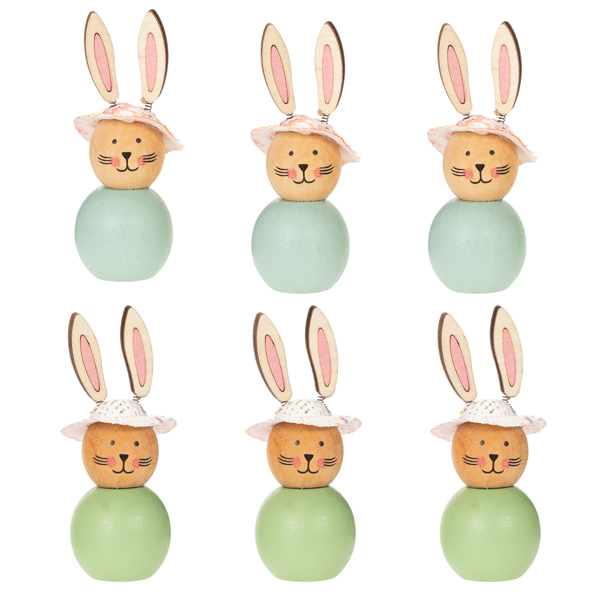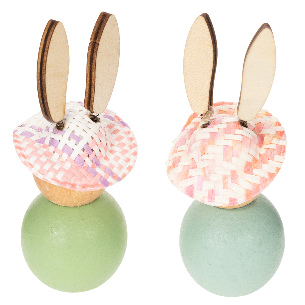 Te drewniane figurki zachwycają naturalnym urokiem i radosnym charakterem: czyste drewno w połączeniu z subtelnymi odcieniami zieleni i mięty tworzy radosny design. Różowe kapelusze nadają figurkom stylowego, vintage'owego charakteru. Każdy królik ma około 9 cm wysokości i wnosi powiew wiosny do Twojego domu. Uszy na metalowych sprężynach nie tylko przyciągają wzrok, ale także stanowią żywy detal, który z pewnością przyciągnie wzrok.