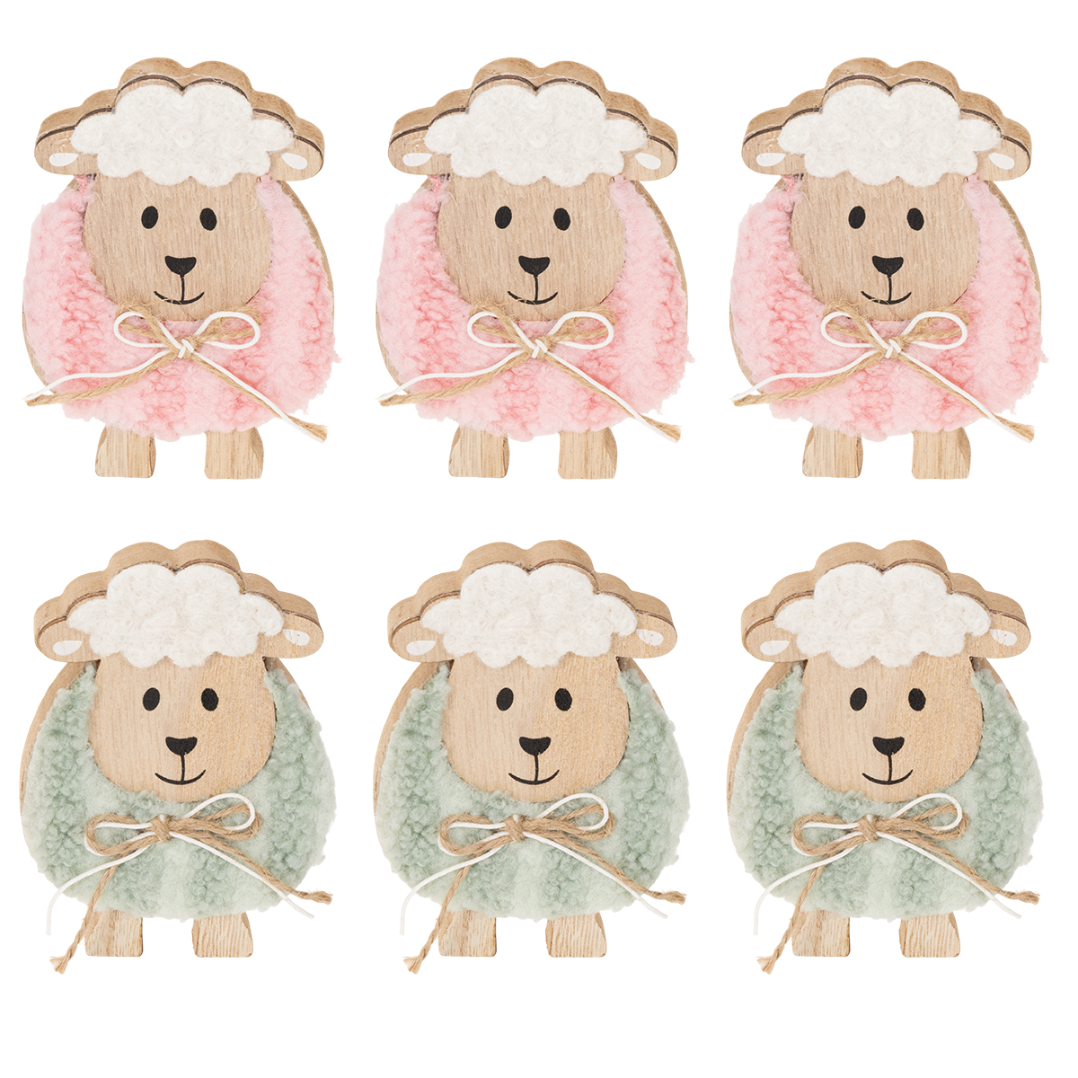 Nazwa produktu: Drewniana ozdoba w kształcie owcy, śliczna figurka dekoracyjna na wiosnę i Wielkanoc, dekoracja stołu, 11 cm, 6 sztuk