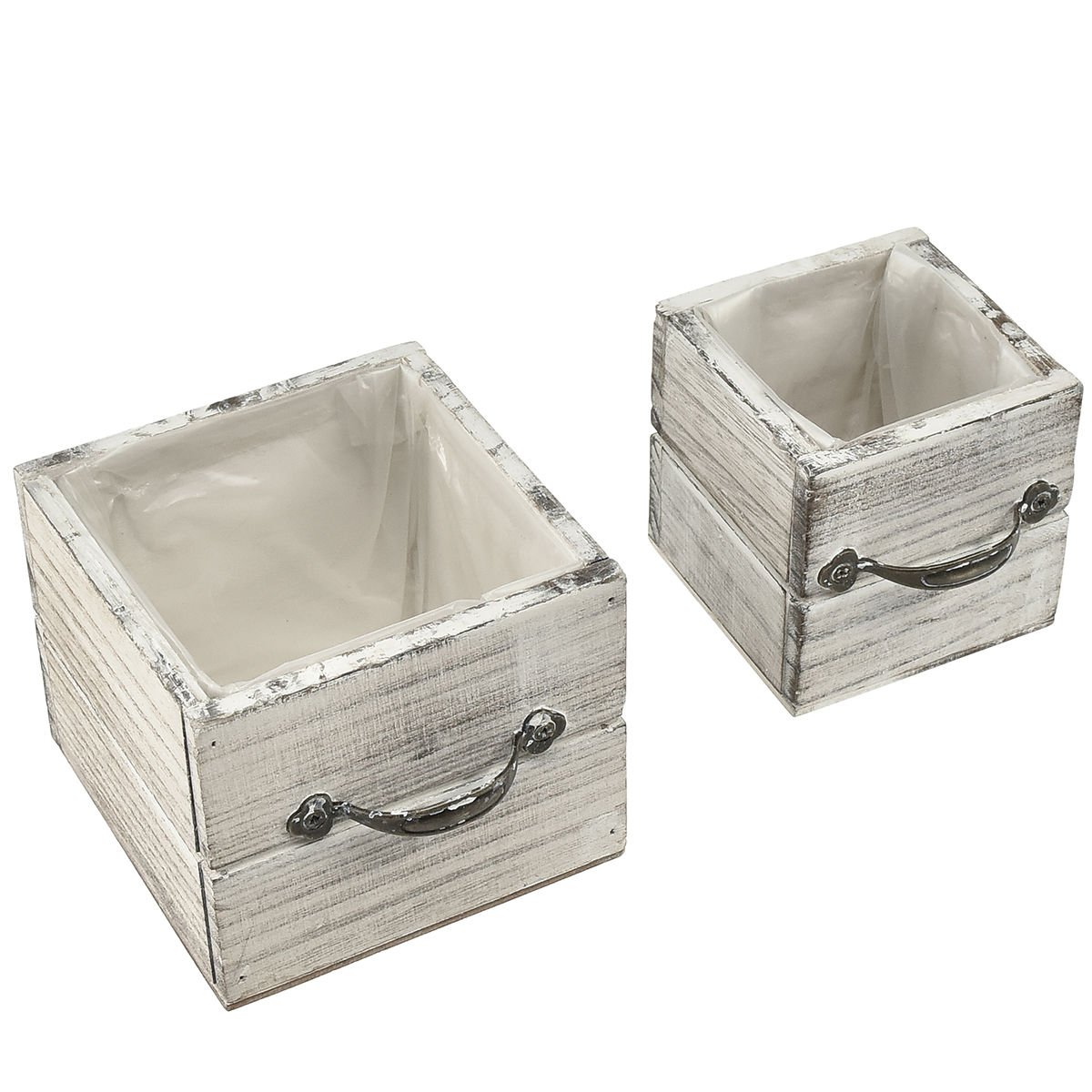 Drewniany zestaw szuflad z uchwytem, przecierany biały, 12 x 12 cm i 9 x 9 cm - Rustykalne przechowywanie - Zestaw 2 szt.