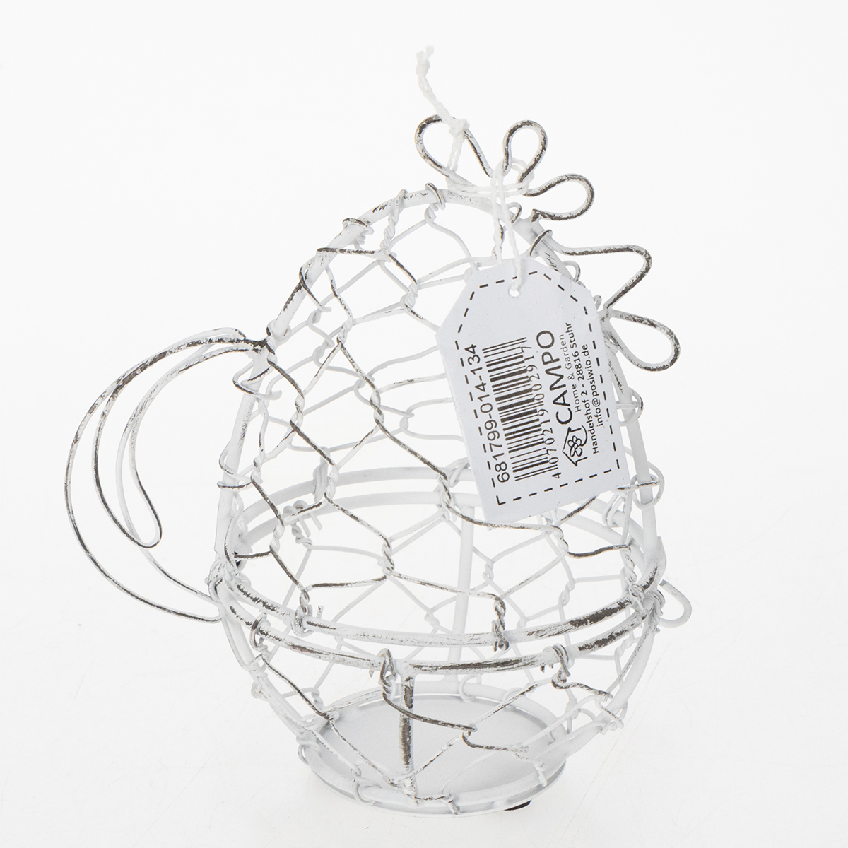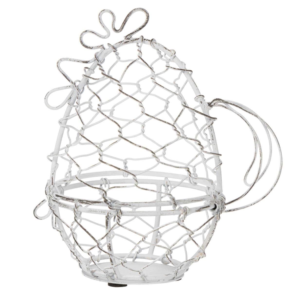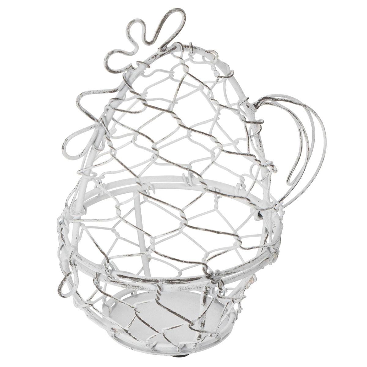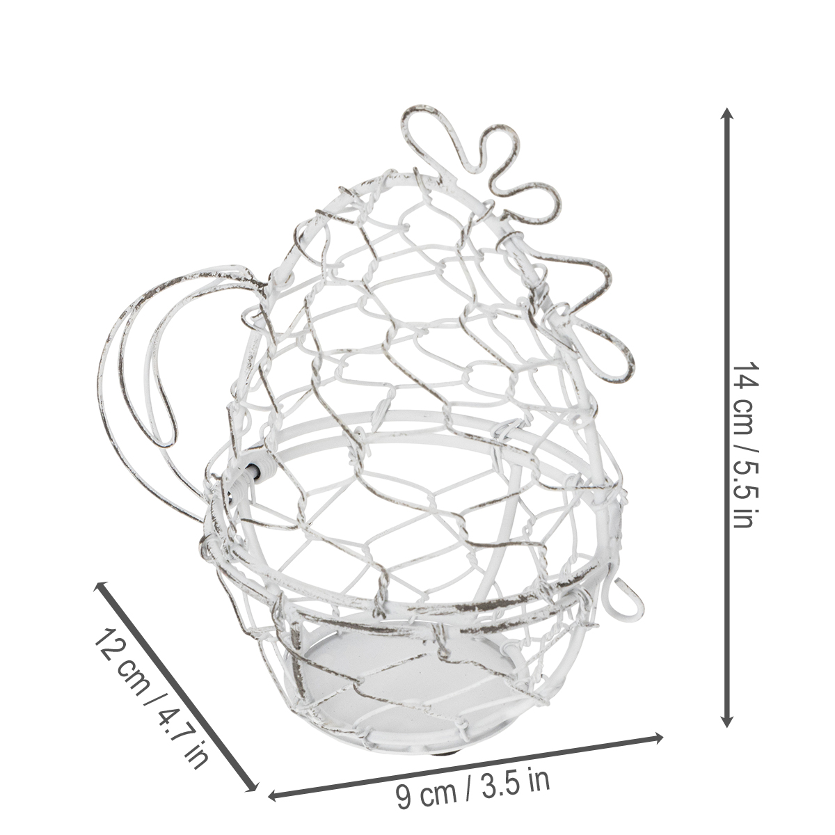 Ten druciany koszyczek w kształcie kurczaka jest nie tylko przyciągający wzrok, ale i niezwykle praktyczny. Mierzy 14 cm wysokości i 12 cm średnicy, dzięki czemu idealnie nadaje się na pisanki. Solidna, biała, metalowa konstrukcja podkreśla czarujący styl shabby chic, który łączy w sobie subtelną elegancję z rustykalnym charakterem. Ponadczasowy design pasuje do różnorodnych stylów wnętrz, od rustykalnego i vintage po nowoczesny.