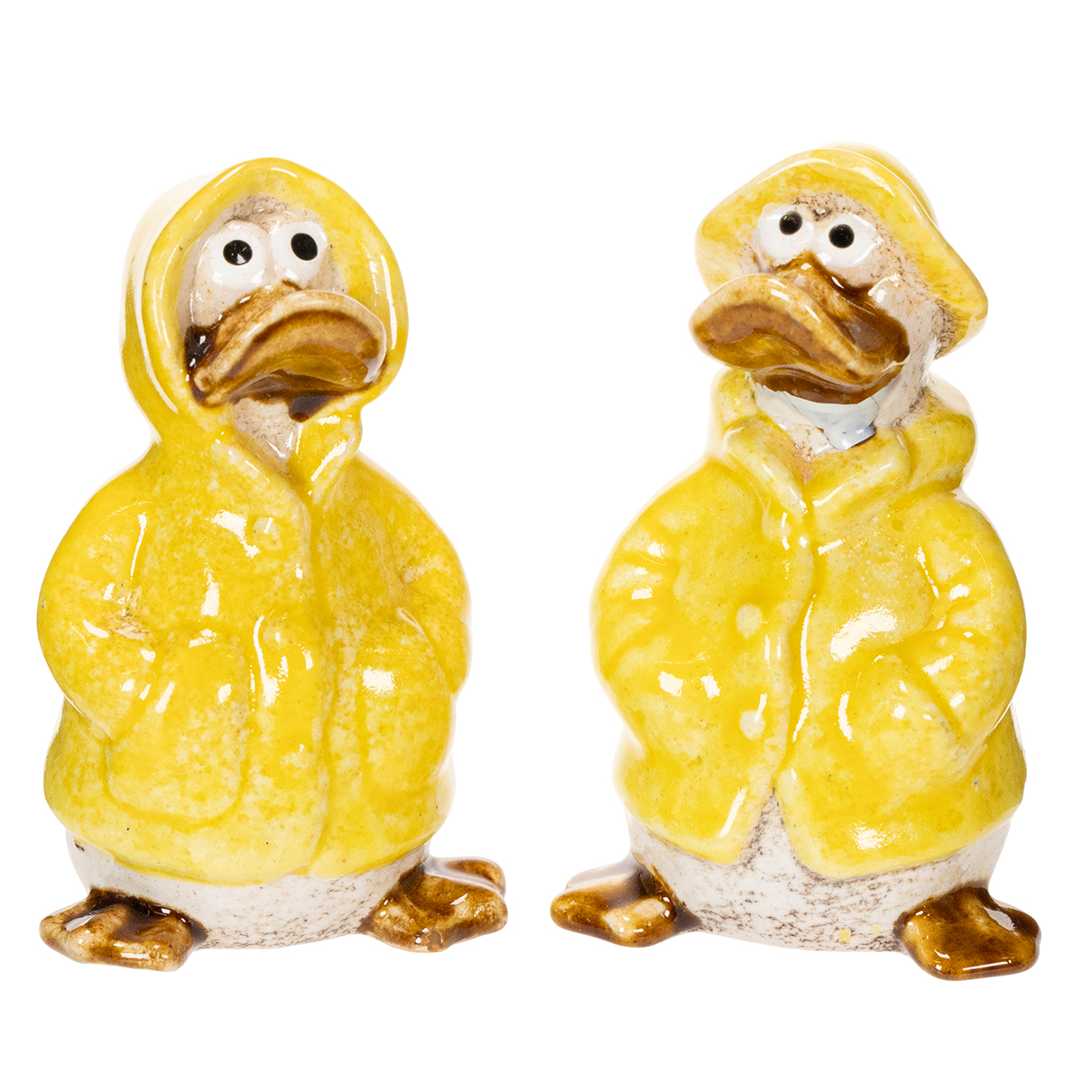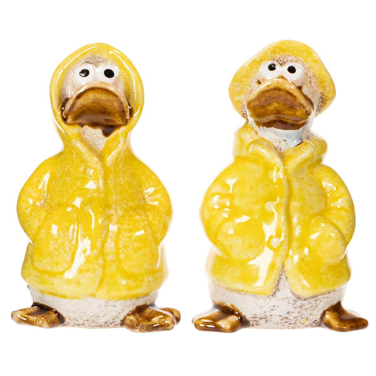 Ceramiczne figurki kaczek w żółtych płaszczach przeciwdeszczowych – zabawne dekoracje na wiosnę i lato